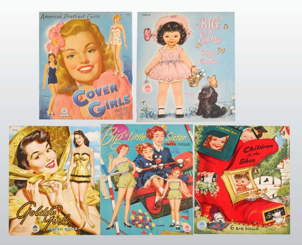 Description c1940s-1950s. This lot includes the following paper dolls: "Big 'N Little Sister," "Children in The Shoe", "Big 'N Easy", "Cover Girls;" and "Golden Girl". All the books are in excellent condition with minor age and wear.