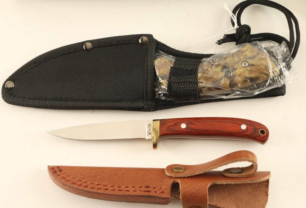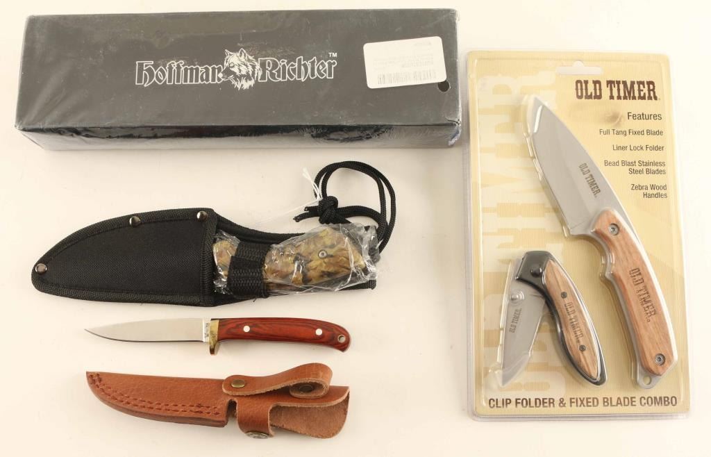 Four total includes: 1 Old Timer fixed blade with sheath and pocket folder new in package. 1 made by Master Knives with sheath. 1 Frost Cutlery "The Whistler" with sheath and 1 Hoffman Richter Talon new in box.