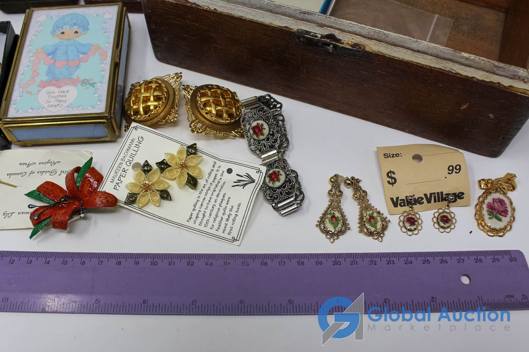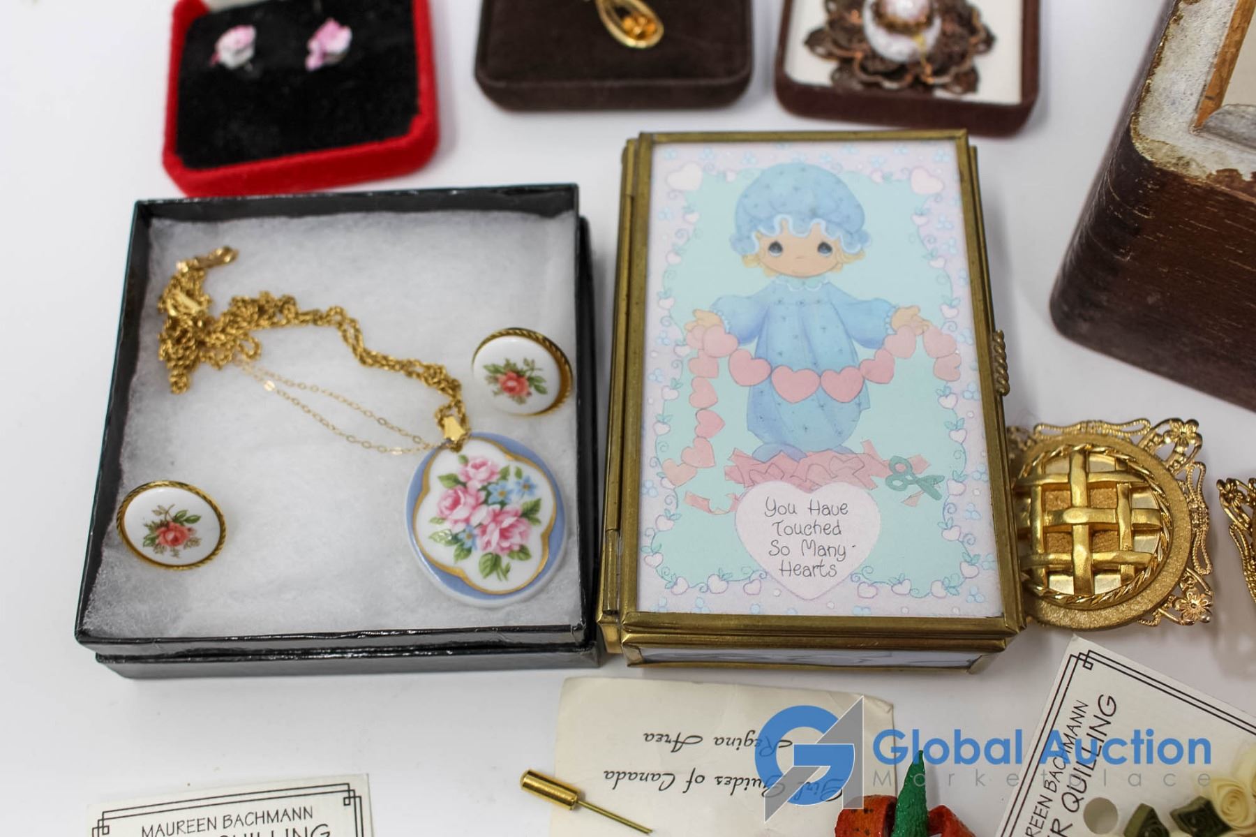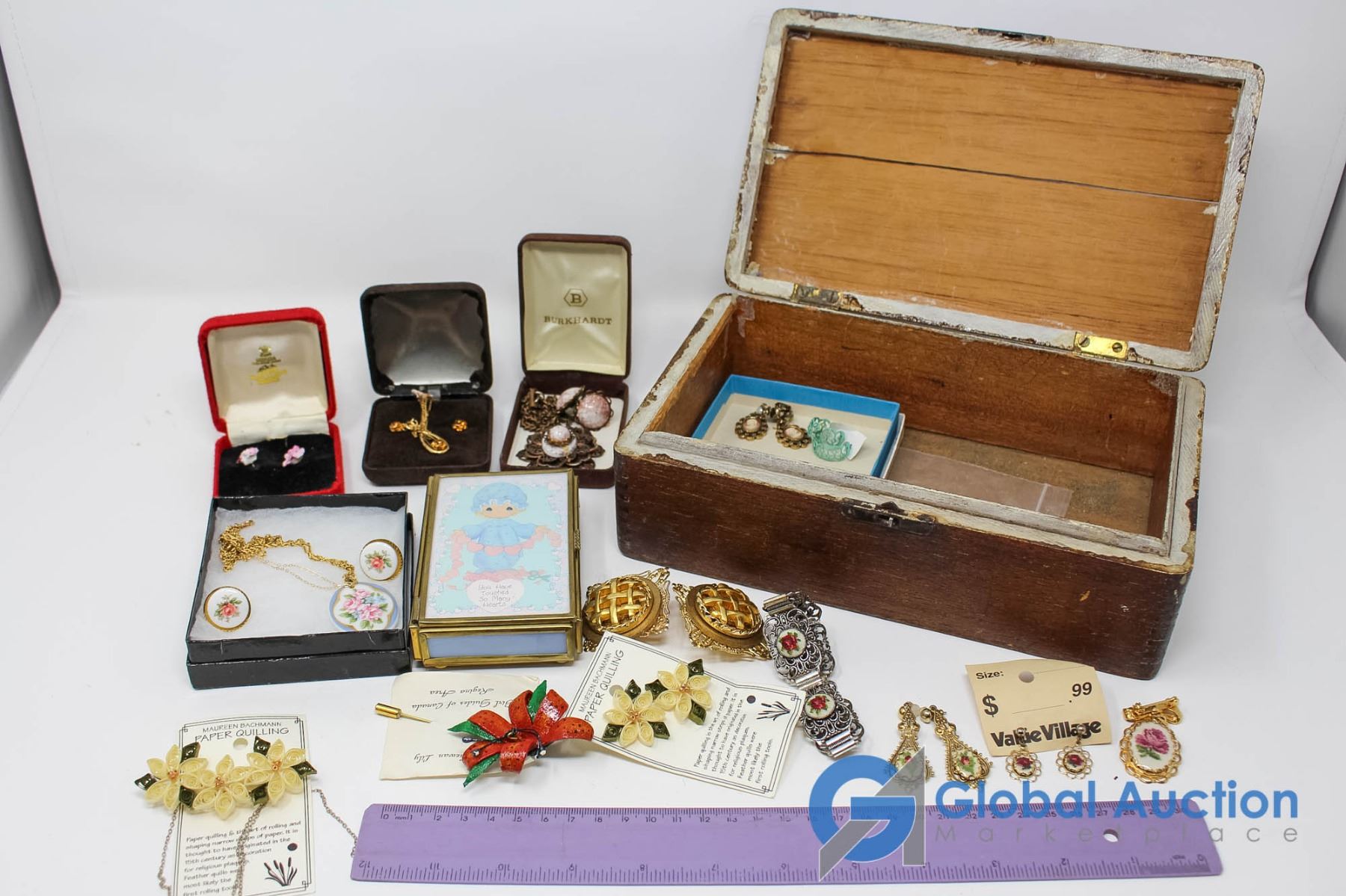 Lot of Flower Themed Jewlery With Latching Wooden Box