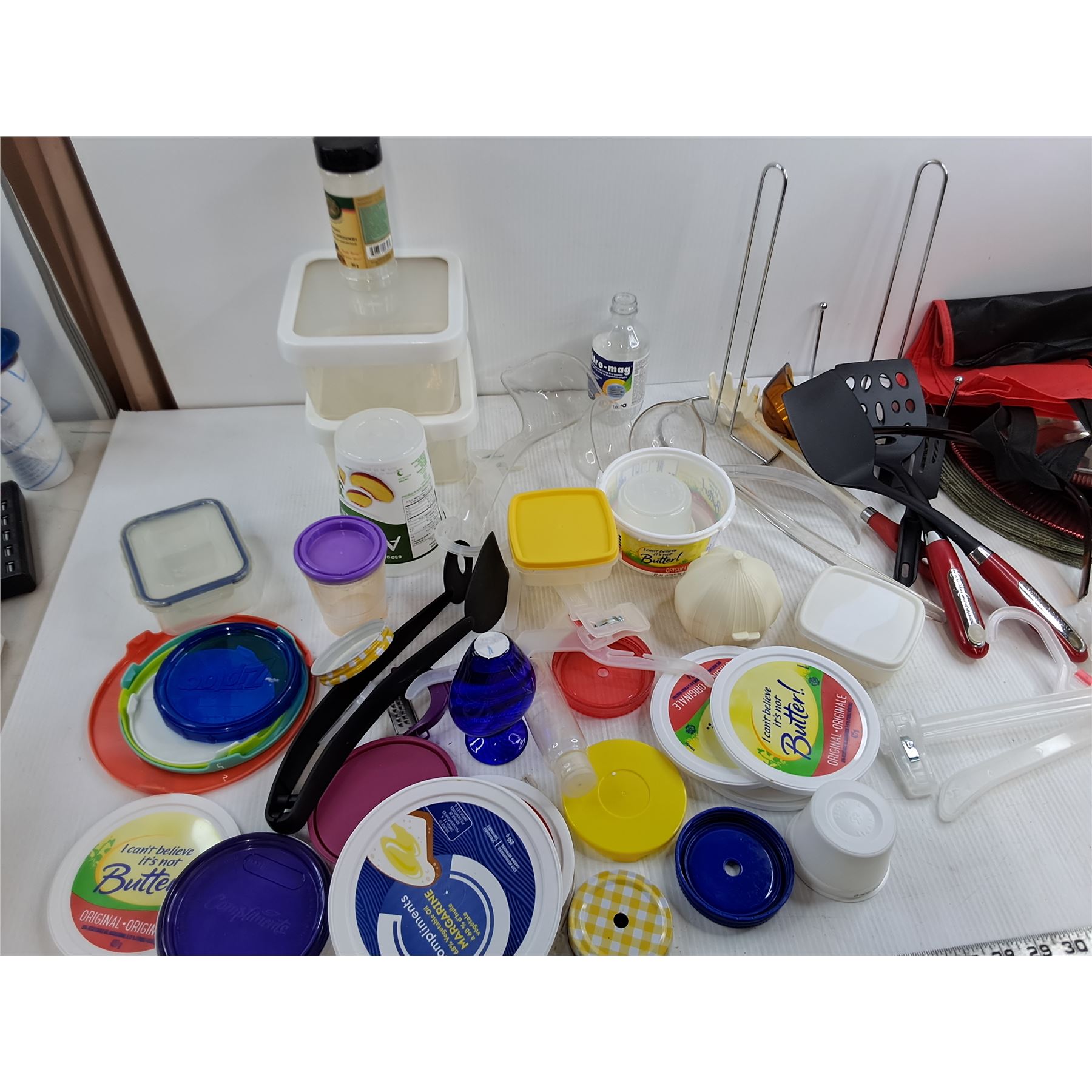 Lot of Food Container Lids, Spatulas, Coat Hangers, Misc