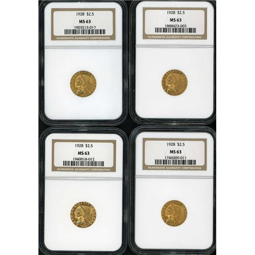 Includes: four 1928 $2.50 NGC MS63 Indian Head Eagles. Lot of 4 coins.