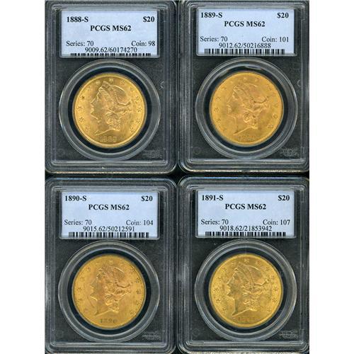 Includes: 1888 S PCGS MS62, 1889 S PCGS MS62, 1890 S PCGS MS62, 1891 S PCGS MS62. Lot of 4 coins.