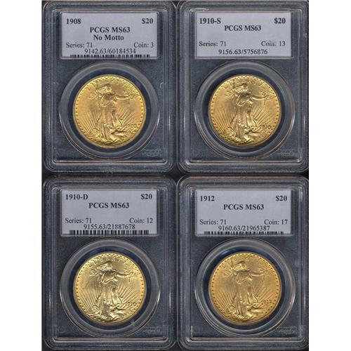 Includes: 1908 No Motto PCGS MS63, 1910-D PCGS MS63, 1910-S PCGS MS63, 1912 PCGS MS63. Lot of 4 coins.