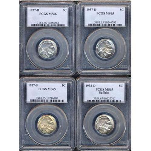 <b>Lot of Four Buffalo Nickels.</b> Includes: 1937-D PCGS MS66, 1937-D PCGS MS65, 1937-S PCGS MS65, and 1938-D PCGS MS65. Lot of 4 coins. <i>