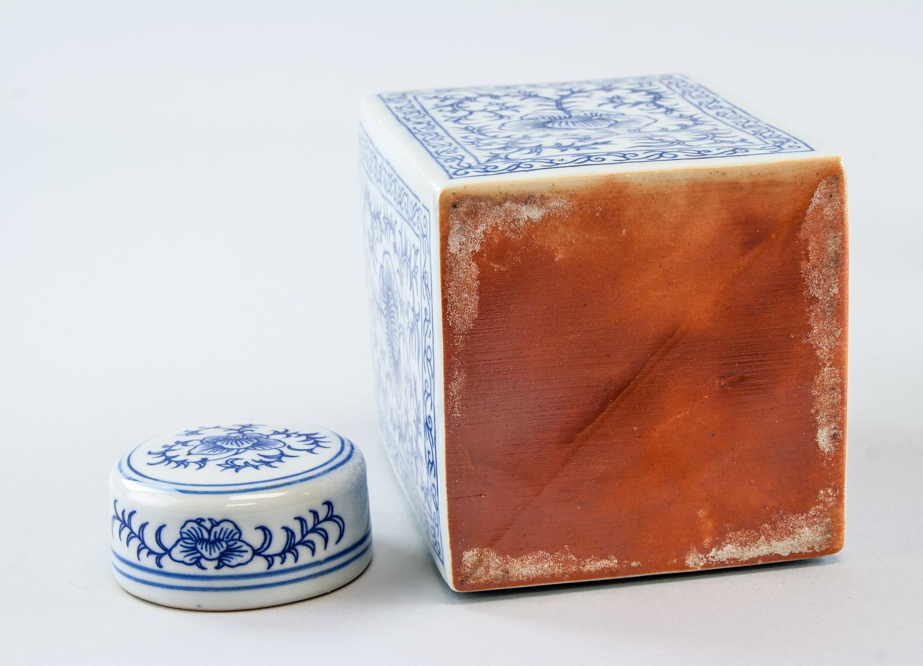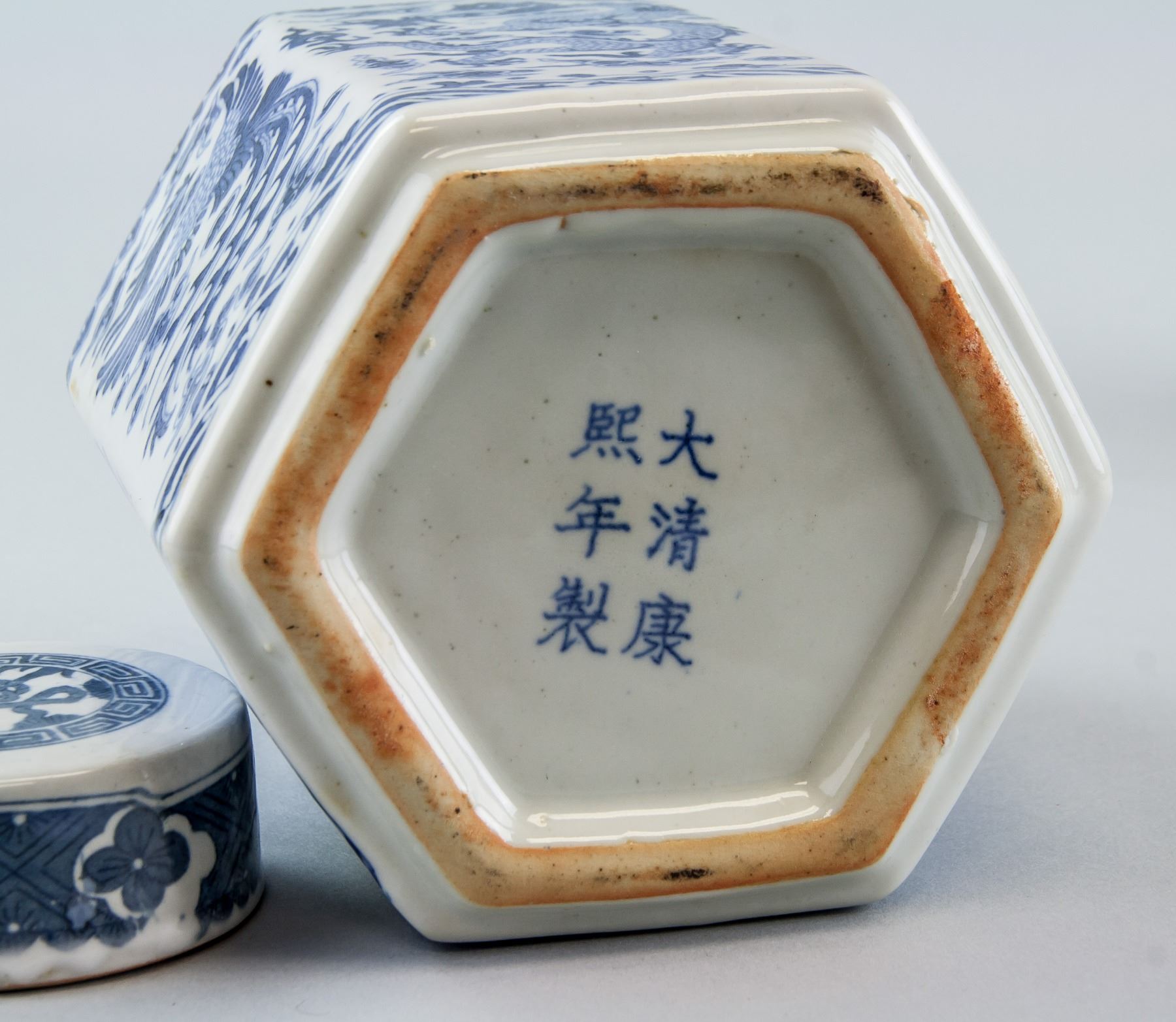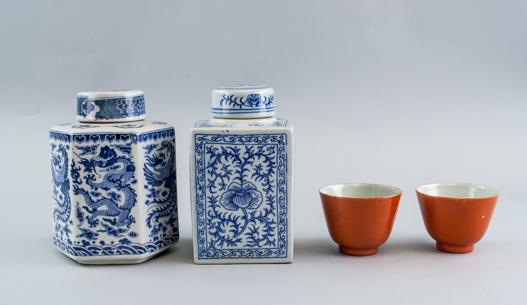 Lot of four (4) Chinese porcelain items. One blue and white porcelain hexagon jar with lid, painted with dragon, six-character Kangxi mark on base, one blue and white porcelain square jar with lid, painted with floral and leafy pattern, pair of red porcelain cup. Four-character Li Taihe mark on base