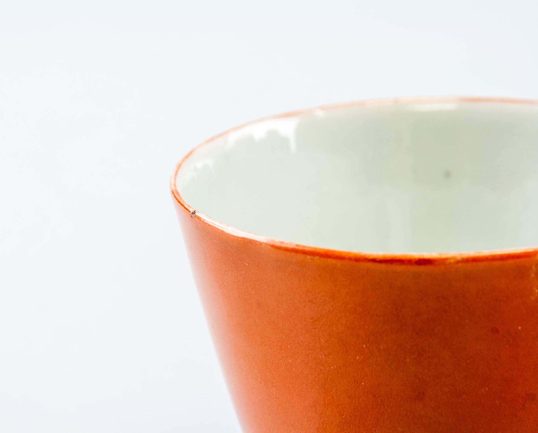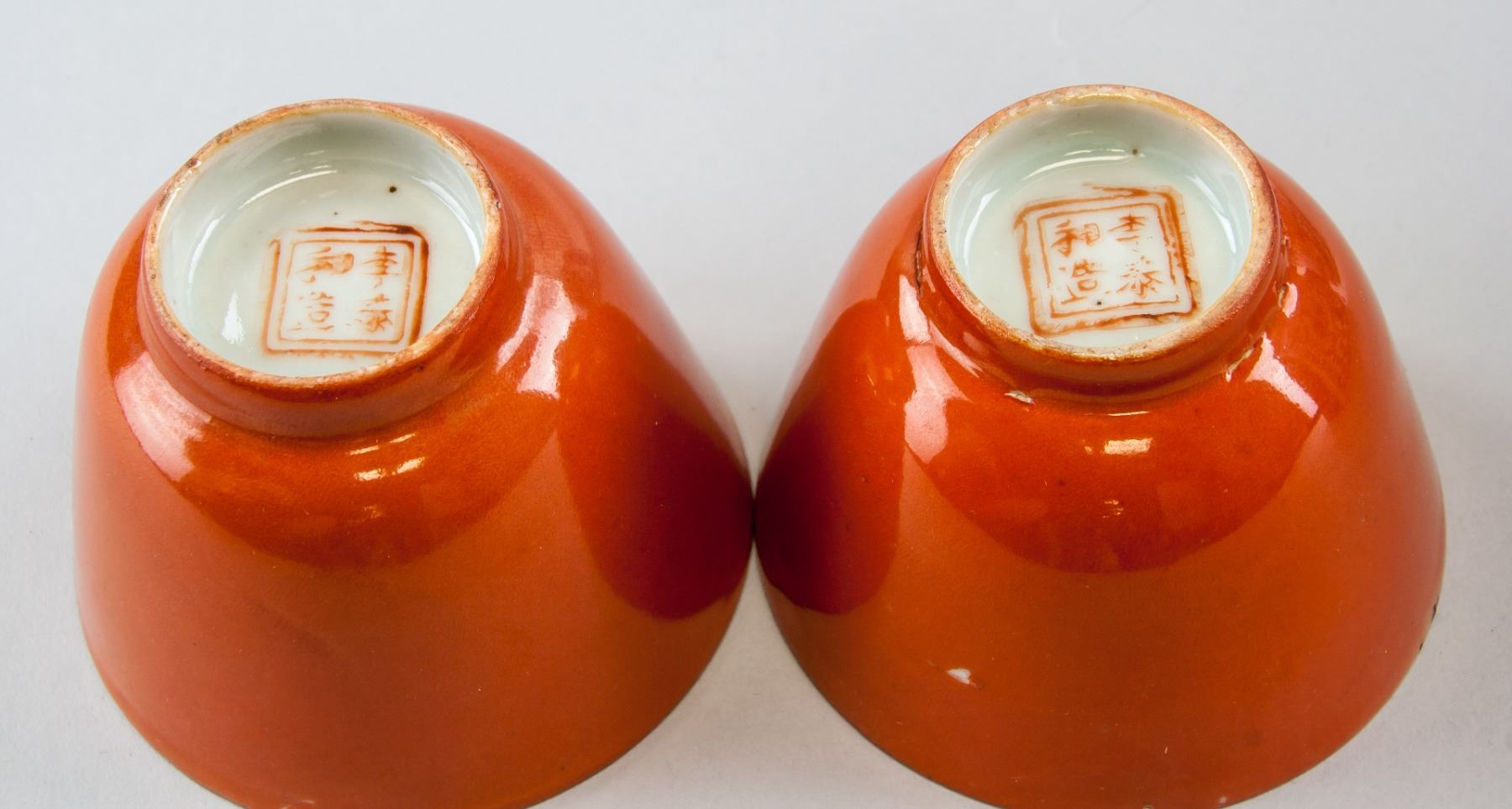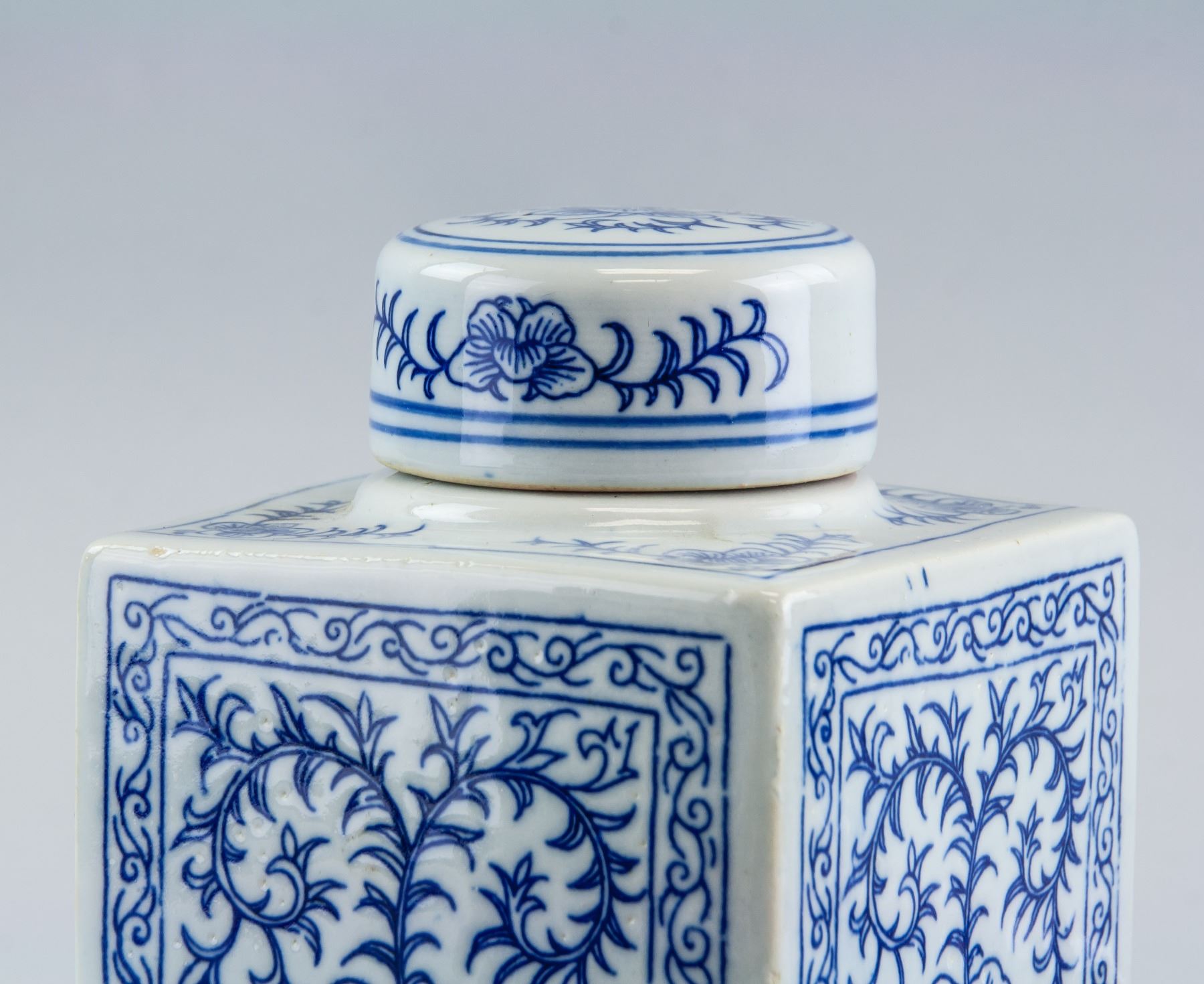 Lot of four (4) Chinese porcelain items. One blue and white porcelain hexagon jar with lid, painted with dragon, six-character Kangxi mark on base, one blue and white porcelain square jar with lid, painted with floral and leafy pattern, pair of red porcelain cup. Four-character Li Taihe mark on base