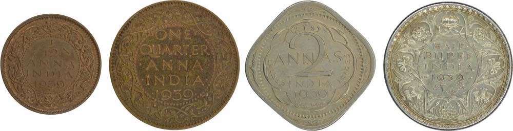 Lot of 4 Coins: 1939, King George VI, Copper 1/12 Anna, Bombay Mint, T/II, (PR # 861), 1939, Bronze 1/4 Anna, Calcutta Mint, (Unlisted in pridemore), 1939, Cupro Nickel 2 Annas, (PR # 905), 1939, Silver 1/2 Rupee, Mature head,(PR # 364), about Very fine to extremely fine.