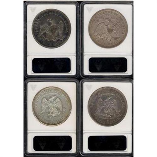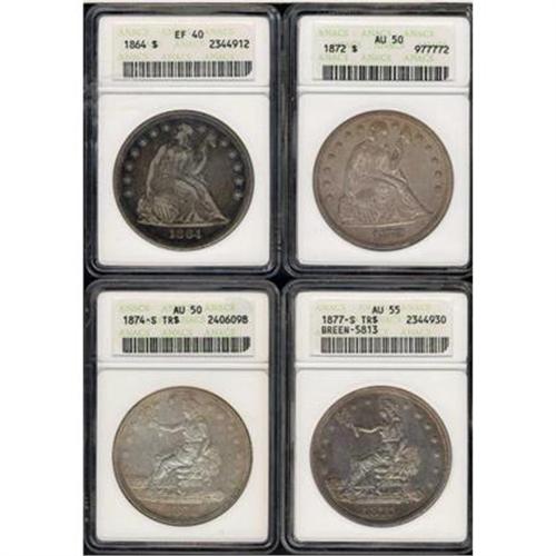 <b>Lot of Four Silver Dollars.</b> Includes: 1864 ANACS EF40 Seated Liberty, 1872 ANACS AU50 Seated Liberty, 1874-S ANACS AU50 Trade, and 1877-S ANACS AU55 Trade (Breen-5813). Lot of 4 coins.