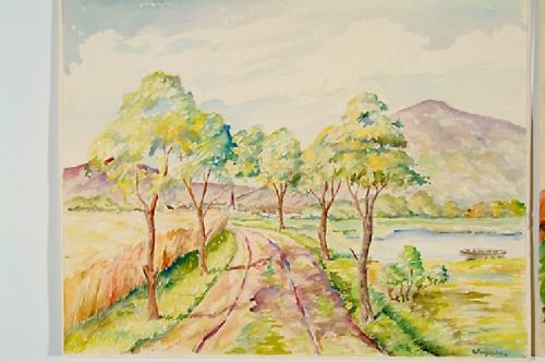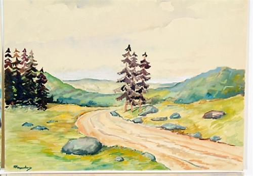 Lot of Four Dutch Watercolors: Quiet Dirt Road in Mountains, Majestic Landscape, Two Trees Landscape