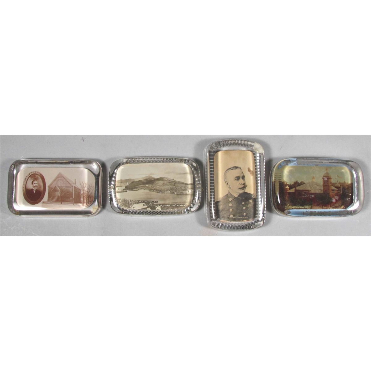 Lot of Four Early Glass Paper Weights including Admiral George Dewey, Lake Placid-NY, Convention Hall-Saratoga and Lewis Peters, Photographer Wholesale for Churches. All in very good condition. Each measures approx. 4 X 2 1/2 inches. Start Price $50
