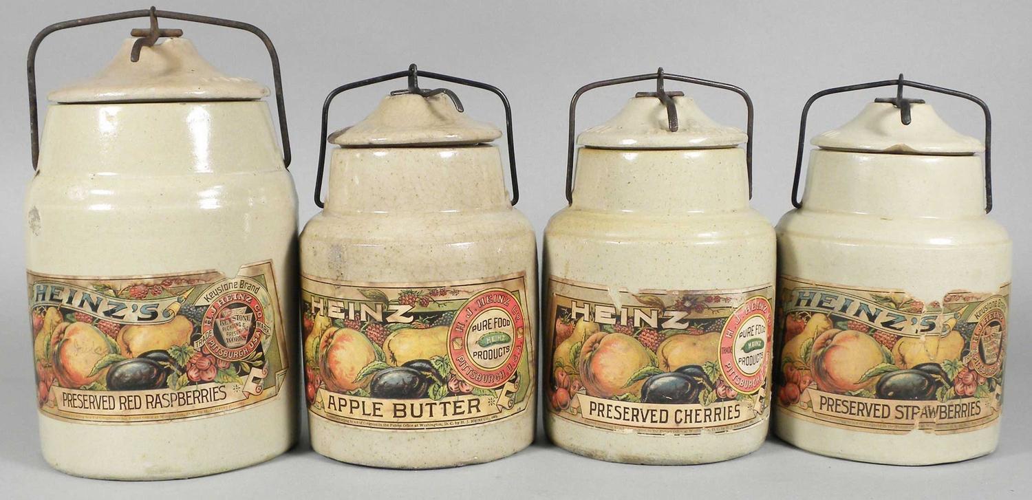 Lot of Four Heinz Crocks with paper labels including Preserved Raspberries, Preserved Cherries, Apple Butter and Preserved Strawberries. Labels in good/very good condition. Two lids have chips otherwise good condition. Largest measures 9 inches tall.