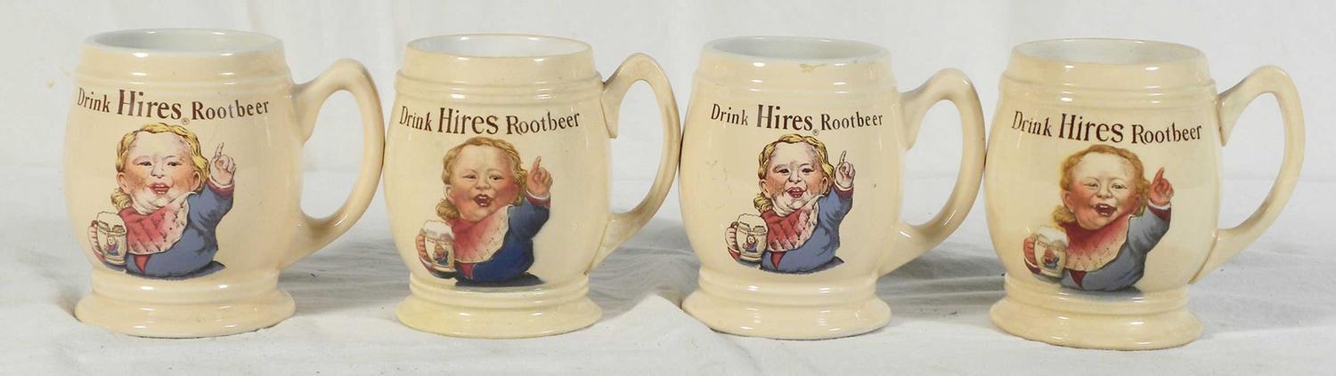 Lot of Four Hires Root Beer Mugs. 2 made in Germany, Mettlach, 2 made by Crush International Inc. Evanston, IL. No chips or cracks. 4 1/2 inches tall.