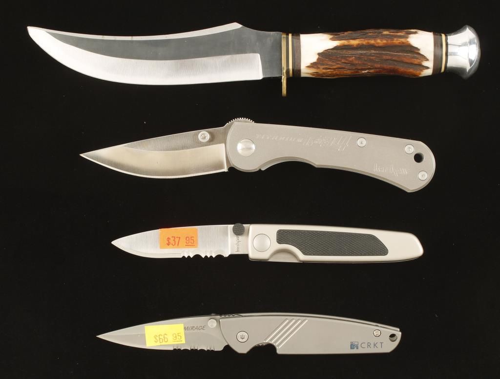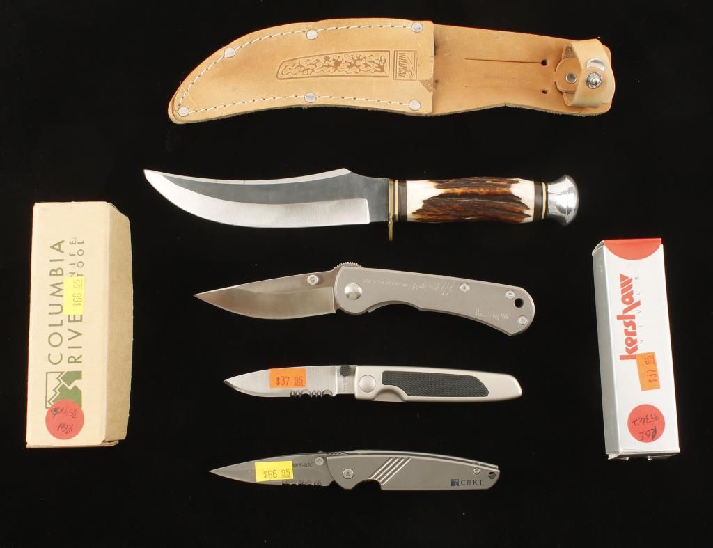 One Wildcat (from Solingen, Germany) sheath knife, one Kershaw Liner Action, one Kershaw Ti ATS34 and one CRKT Mirage.