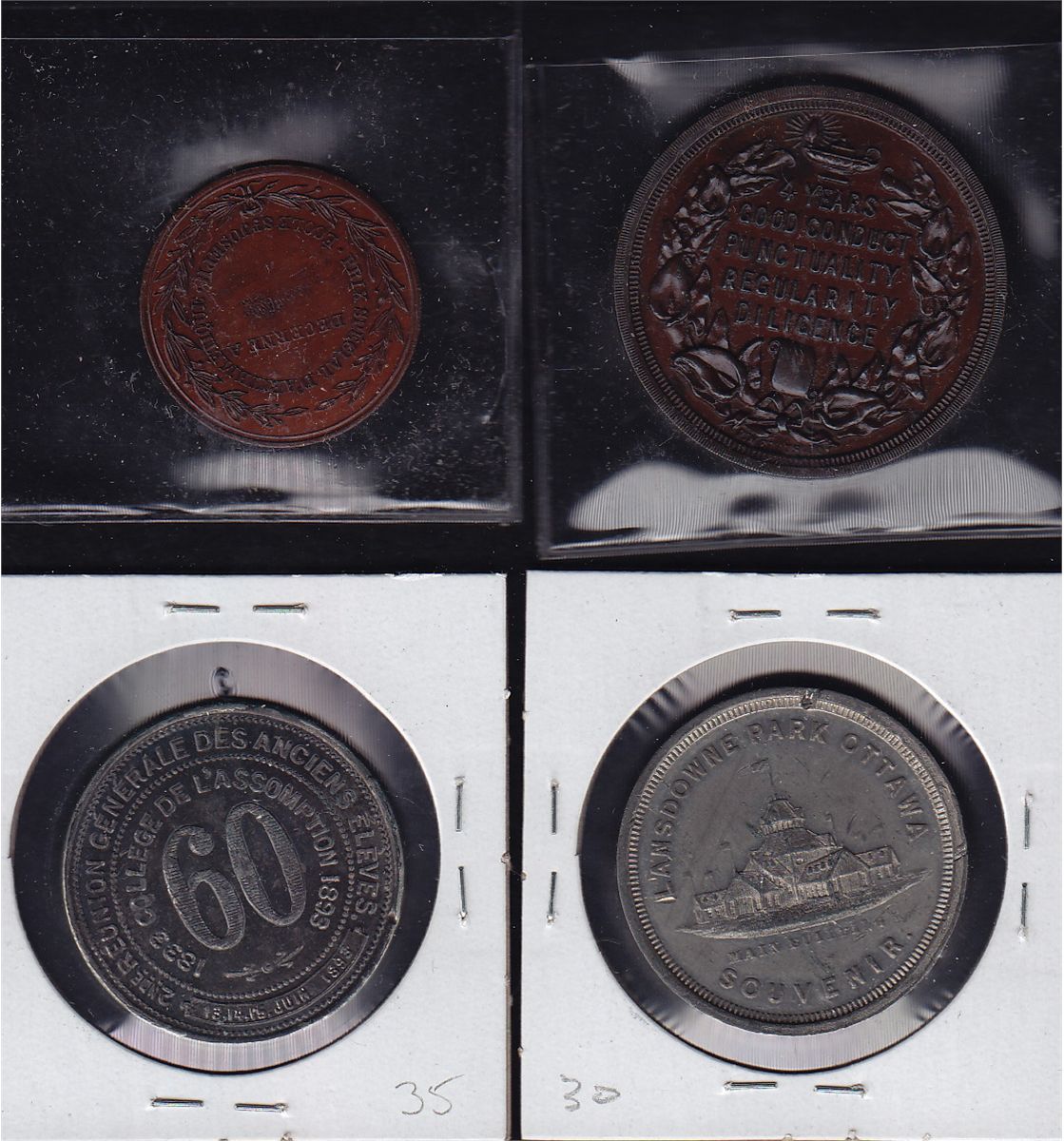 Lot of Four Leroux Medals - 1 - Leroux 1235f Jean Baptiste, Montreal, QC. CU, UNC. 2 - Leroux 1235j 60th Anniversary du College de L'assomption, QC, 1893. WM, EF. 3 - Leroux 1331a Toronto public school board, 4 years. CU, AU/UNC. 4 - Lansdowne Park, Ottawa, ON. WM, AU. 4 Pcs.