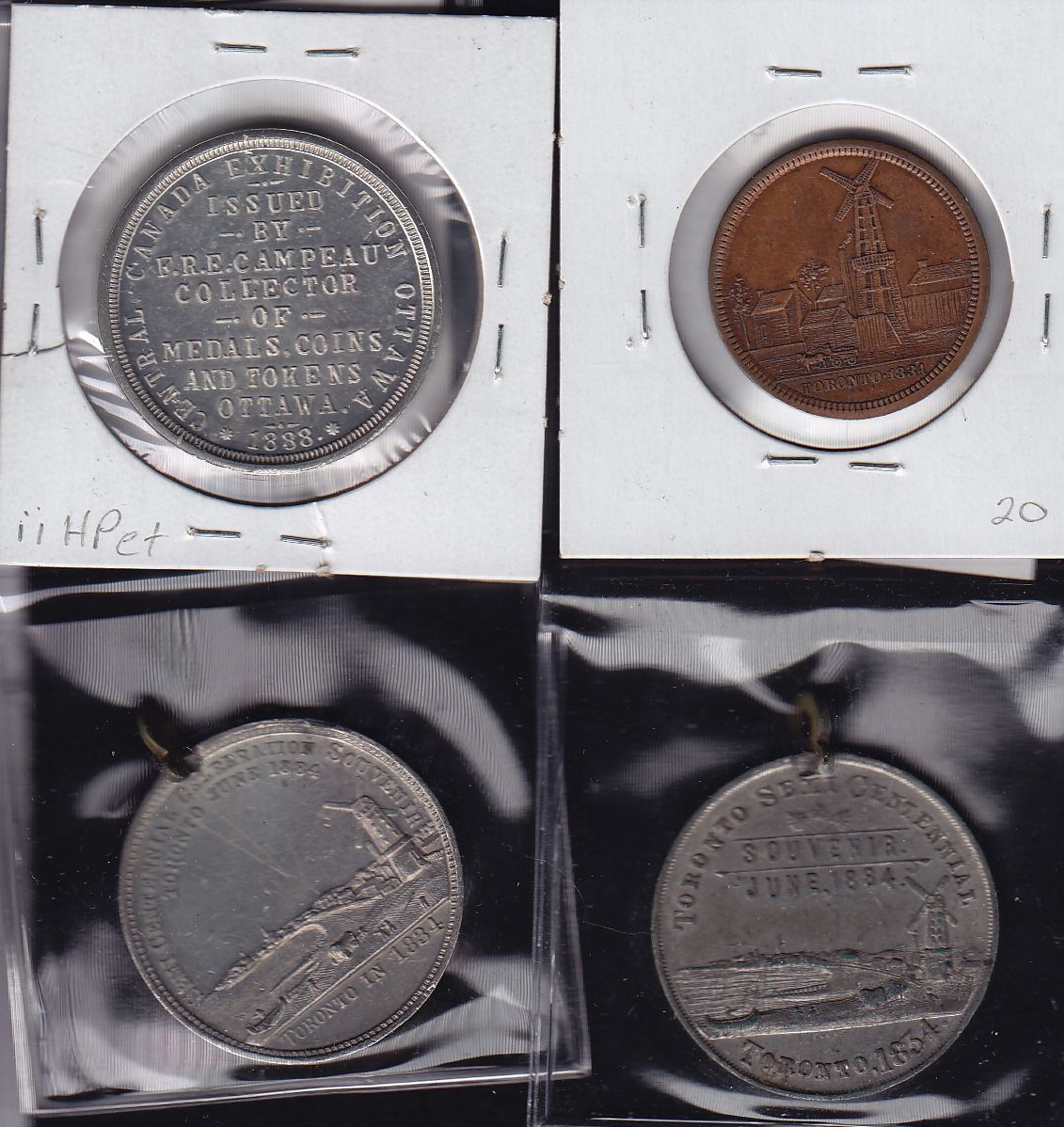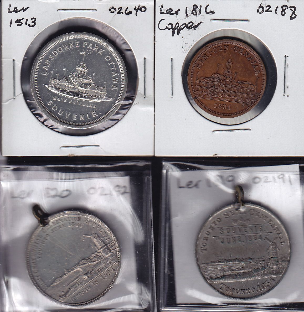 Lot of Four Leroux Medals - 1- Leroux 1513 Central Canada Exhibition, Ottawa. WM, UNC. 2 - Leroux 1816 Toronto Semi-Centennial - 1884. CU, AU. 3 - Leroux 1819 Toronto Industrial Exhibition - 1884. MW, looped, AU. 4 - Leroux 1820 Toronto Semi-Centennial - 1884. WM, looped, AU. 4 Pcs.