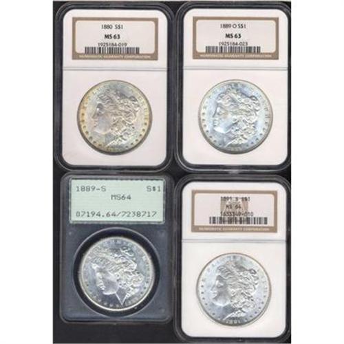 <b>Lot of Four Morgan Dollars.</b> Includes: 1880 NGC MS63, 1889-S PCGS MS64, 1889-O NGC MS63, and 1891-S NGC MS64. Lot of 4 coins.