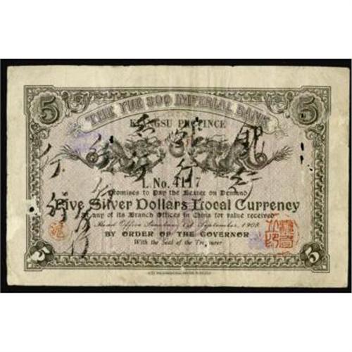 <style type="text/css"> body, td, th { font-family: Arial, Helvetica, sans-serif; font-size: 12px; color: #482424; margin: 0px; padding: 0px; } #header { background-image: url(http://www.bowersandmerena.com/ebay/images/template_v3_01.gif); clear: both; background-color: #590303; border-top-width: 2px; border-top-style: solid; border-top-color: #B38C4F; } #header #header_wrapper { height: 75px; clear: both; width: 800px; margin-right: auto; margin-left: auto; background-image: url(http://www.bowersandmerena.com/ebay/images/template_v3_03.gif); background-repeat: no-repeat; background-position: right; color: #F3EDCC; } #header #header_wrapper #header_logo { float: left; height: 75px; width: 444px; background-image: url(http://www.bowersandmerena.com/ebay/images/template_v3_02.gif); background-repeat: no-repeat; font-size: 10px; text-transform: capitalize; color: #B38C4F; } #header #header_wrapper #header_right { float: left; height: 75px; width: 356px; text-align: right; } #header #header_wrapper #header_right #headerLoginBtn { margin-bottom: 30px; } #header #header_wrapper #header_right input#txtSearch { color: #B49056; border: 1px solid #B49056; width: 175px; padding-top: 3px; padding-right: 3px; padding-bottom: 4px; padding-left: 3px; } #nav { height: 37px; background-image: url(http://www.bowersandmerena.com/ebay/images/template_v3_05.gif); clear: both; } #nav #nav_wrapper { height: 35px; width: 800px; margin-right: auto; margin-left: auto; border-left-width: 1px; border-left-style: solid; border-left-color: #B38C4F; } #nav #nav_wrapper a { padding-right: 15px; padding-left: 15px; border-right-width: 1px; border-right-style: solid; border-right-color: #B38C4F; height: 25px; padding-top: 10px; display: block; float: left; text-decoration: none; font-weight: bold; color: #5D0303; } #nav #nav_wrapper a:hover { color: #B38C4F; } #nav #nav_wrapper #search { float: right; padding-top: 7px; } #nav #nav_wrapper #search #txtSearch { font-family: Arial, Helvetica, sans-serif; font-size: 10px; text-transform: uppercase; color: #D2AE75; border: 1px solid #B38C4F; padding: 3px; } #content_bgd { background-image: url(http://www.bowersandmerena.com/ebay/images/template_v3_09.gif); background-repeat: repeat-y; background-position: center; padding-top: 15px; padding-bottom: 15px; background-color: #FBFBDB; } #content_wrapper { clear: both; height: auto; width: 800px; margin-right: auto; margin-left: auto; } .LotDetailWhite { line-height:normal; font-size:13px; font-family: arial,helvetica,sans-serif; color: White; font-weight: bold; } .LotDetailInformation { line-height:normal; font-size: 13px; font-family: arial,helvetica,sans-serif; } .LotDetailMessage { line-height:normal; font-size: 13px; font-family: arial,helvetica,sans-serif; color: red; } } tr.HeaderAuctionTitle td { color: #000000; font-weight: bold; padding: 2px; background-image: url(http://www.bowersandmerena.com/ebay/images/template_v3_05.gif); background-repeat: repeat-x; border-bottom-width: 1px; border-bottom-style: solid; border-bottom-color: #B38C4F; } table.AuctionSummary a, table.AuctionSummary a:link, table.AuctionSummary a:visited { color: #0000FF; text-decoration: none; } } td.tableHeaderLeft { border-left-width: 1px; border-left-style: solid; border-left-color: #B38C4F; } td.tableHeaderRight { border-right-width: 1px; border-right-style: solid; border-right-color: #B38C4F; } td.tableCellMiddle { border-left-width: 1px; border-left-style: solid; border-left-color: #B38C4F; border-right-width: 1px; border-right-style: solid; border-right-color: #B38C4F; padding: 5px; } tr.footer td { border-top-width: 1px; border-top-style: solid; border-top-color: #B38C4F; } </style> </head> <body> <div id="header"> <div id="header_wrapper"> <div id="header_logo"> </div> <div id="header_right"> </div> </div> </div> <div id="nav"> <div id="nav_wrapper"> <a href="http://www.bowersandmerena.com">Our eBayLive Auctions</a> <a href="#PaymentInfo">Payment Information</a> <a href="#ShippingInfo">Shipping Information</a> <a href="#About">About Bowers and Merena</a> </div> </div> <div id="content_bgd"> <div id="content_wrapper"> <table width="100%" border="0" cellpadding="5" cellspacing="0" class="AuctionSummary"> <tbody> <tr class="HeaderAuctionTitle" style="height: 25px;"> <td align="left" class="tableHeaderLeft" > </td> <td align="center" class="tableHeaderRight"> <span style="font-size: large;">Lot #568. Provincial Banks. Lot of Four Notes, Various Issuers.</span> </td> </tr> <tr> <td colspan="3" class="tableCellMiddle"> Yu Ning Bank of Kiangsi. P-S1173, 50 Coppers 1907 Fine and very rough; Kiangsu Farmers Bank. P-S1198, 50 Cents 1936 Fine+; Kiangsu Finance Department. P-S1224, 30 Coppers 1939 F-VF; The Yue Soo Imperial Bank. P-S1233a, Five Dollars 1908 Fine but with 9 small holes. Hinges attached on back. This example has its corners intact, thus rare.