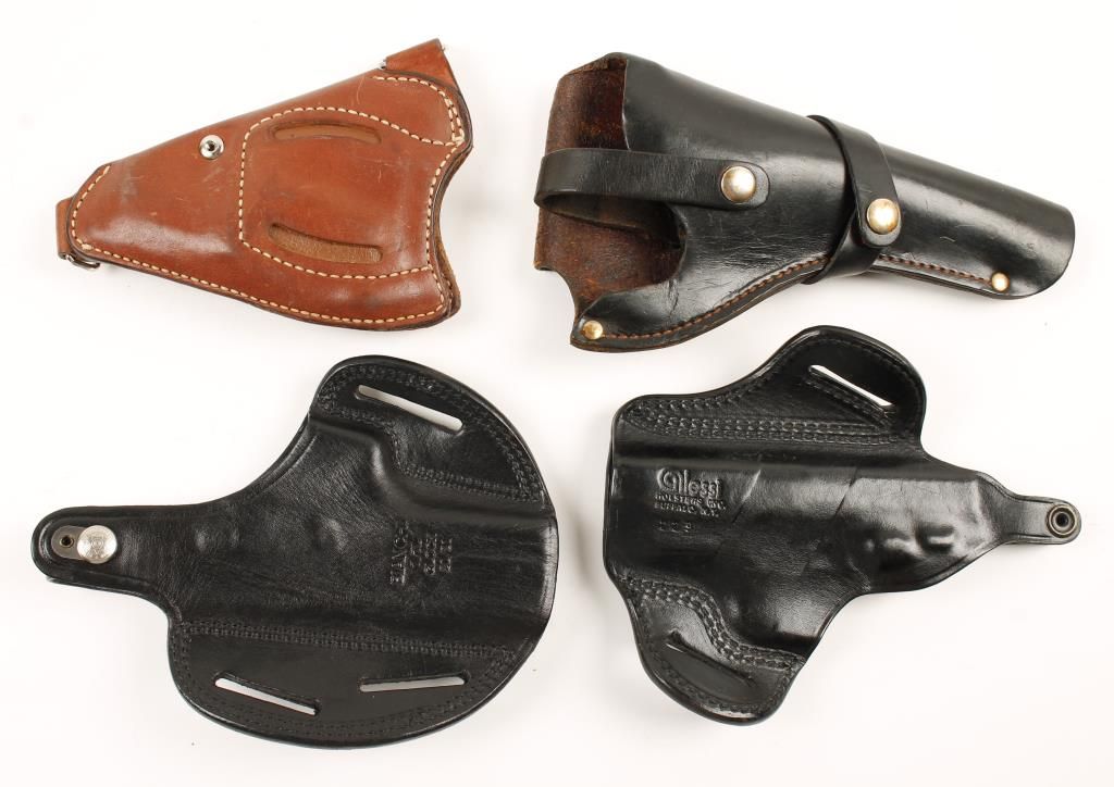 Black Leather #7/7L fits the Glock 20/21 Pistol; Bianchi Model 9RC Clam Shell Brown Leather fits the .38/.357 S&W revolver and is reversible, for wearing either left or right hand; Alessi Black Leather Formed to fit the 1911 and a Black Leather snap strap Holster of a large revolver.
