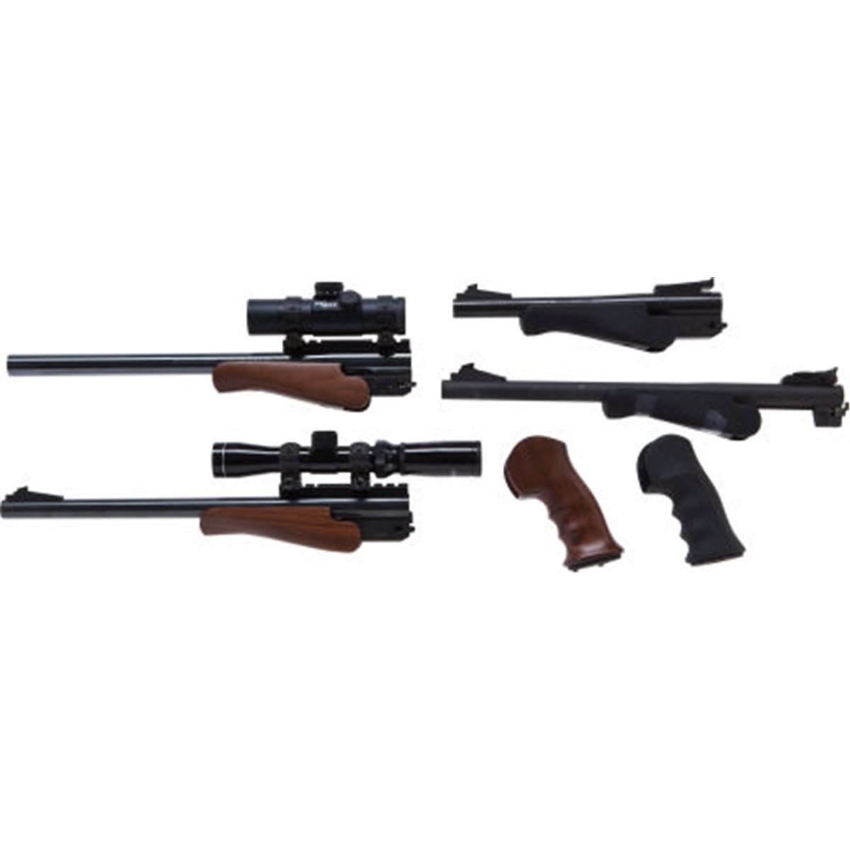 Lot of Four Thompson Center Arms Barrels. Comprising: 1) T/C Custom Shop Encore 15-inch barrel chambered for .45/70 caliber. Black synthetic grips and Tasco telescopic sight. 2) T/C Custom Shop 15-inch barrel chambered for 6.5x55. Hardwood grip and Pro-Point Tasco telescopic sight. 3) Encore 15-inch barrel chambered for .30-06. Hardwood fore-end and Tasco telescopic sight. 4) Unmarked 15-inch barrel chambered for .358 caliber with synthetic fore-end. Appears to be a Thompson Center Arms issued in a black matte finish.Condition: Excellent. All appear unused with a few scuffs and light surface rust from poor handling and storage.NRA FIREARMS FOR FREEDOM PROGRAM