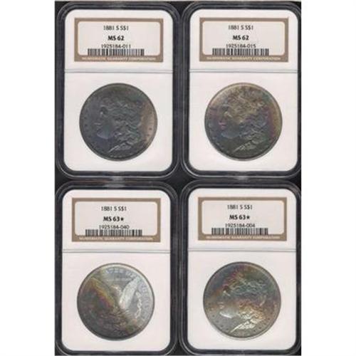 <b>Lot of Four Toned Morgan Dollars.</b> Includes two obverse toned 1881-S NGC MS62, a reverse toned 1881-S NGC MS63* and an obverse toned 1881-S NGC MS63*. Lot of 4 coins.