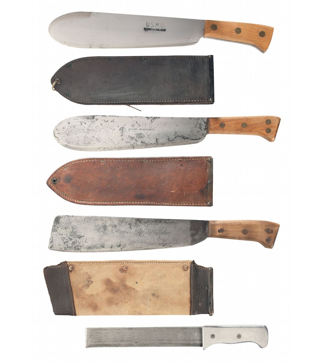 This lot includes; 1) U.S.M.C. bolo knife with 11 1/2" blade marked "U.S.M.C./CHATILLON, N.Y." with sheath marked "U.S./Boyt/1942" and belt hanger. 2) U.S.M.C. Bolo knife with 11 3/8" blade marked "U.S.M.C./VILLAGE BLACKSMITH" with sheath marked "U.S.M.C./Boyt/1944 and belt hanger. 3) U.S.M.C. machete with 11 1/2" blade with squared tip marked "U.S.M.C." on right side and unrecognizable trademark and "No 1001" on the left side. 4) Unmarked Australian made U.S. Army Air Corp pilot's survival machete with 8 1/2" blade with square tip. Overall very good.