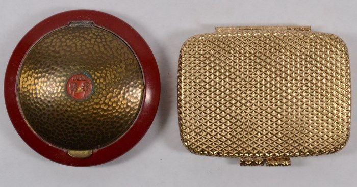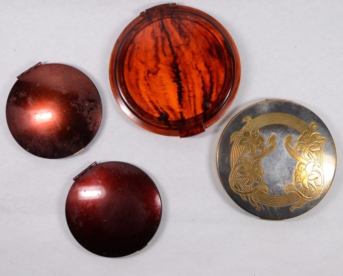 Two (2) compacts are signed Estee Lauder and are mirrors. 3.25" in diameter. One compact is tortoise shell colored plastic signed Comptone, Fifth Avenue and is in average vintage condition - 4.5" in diameter. The fourth compact is two tone metal and is 4" in diameter. Est. Value is $65-$75