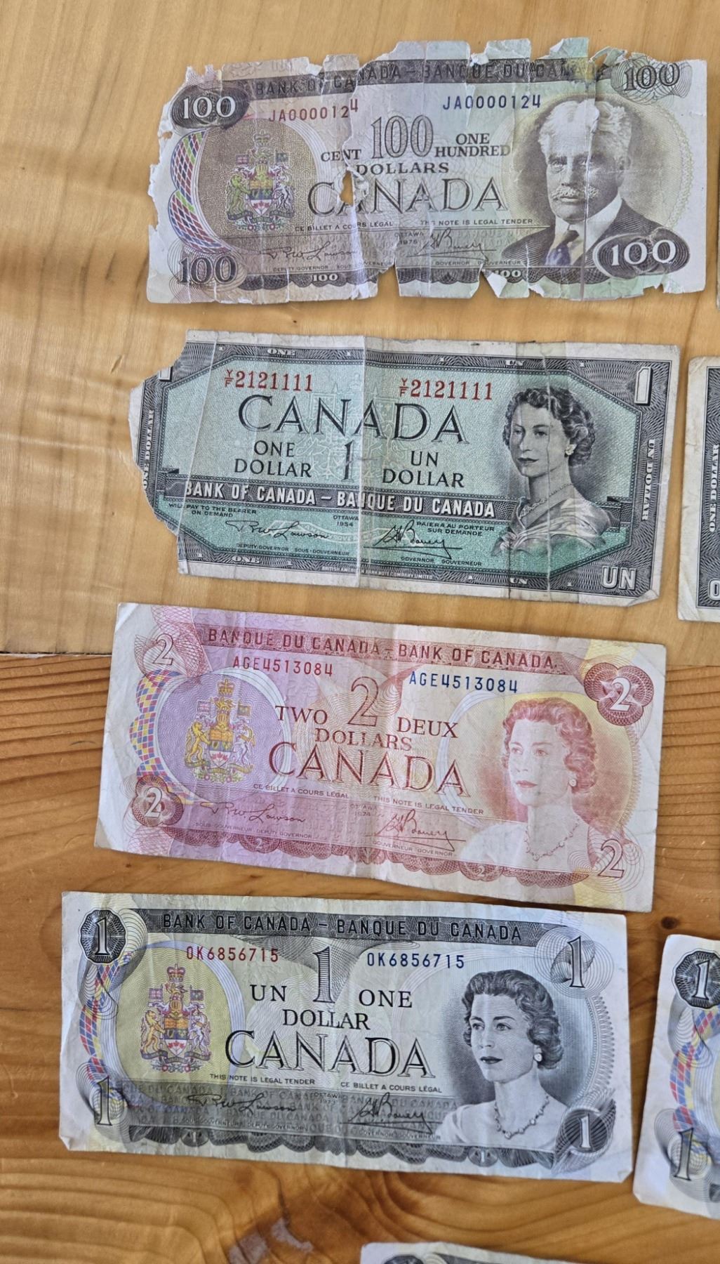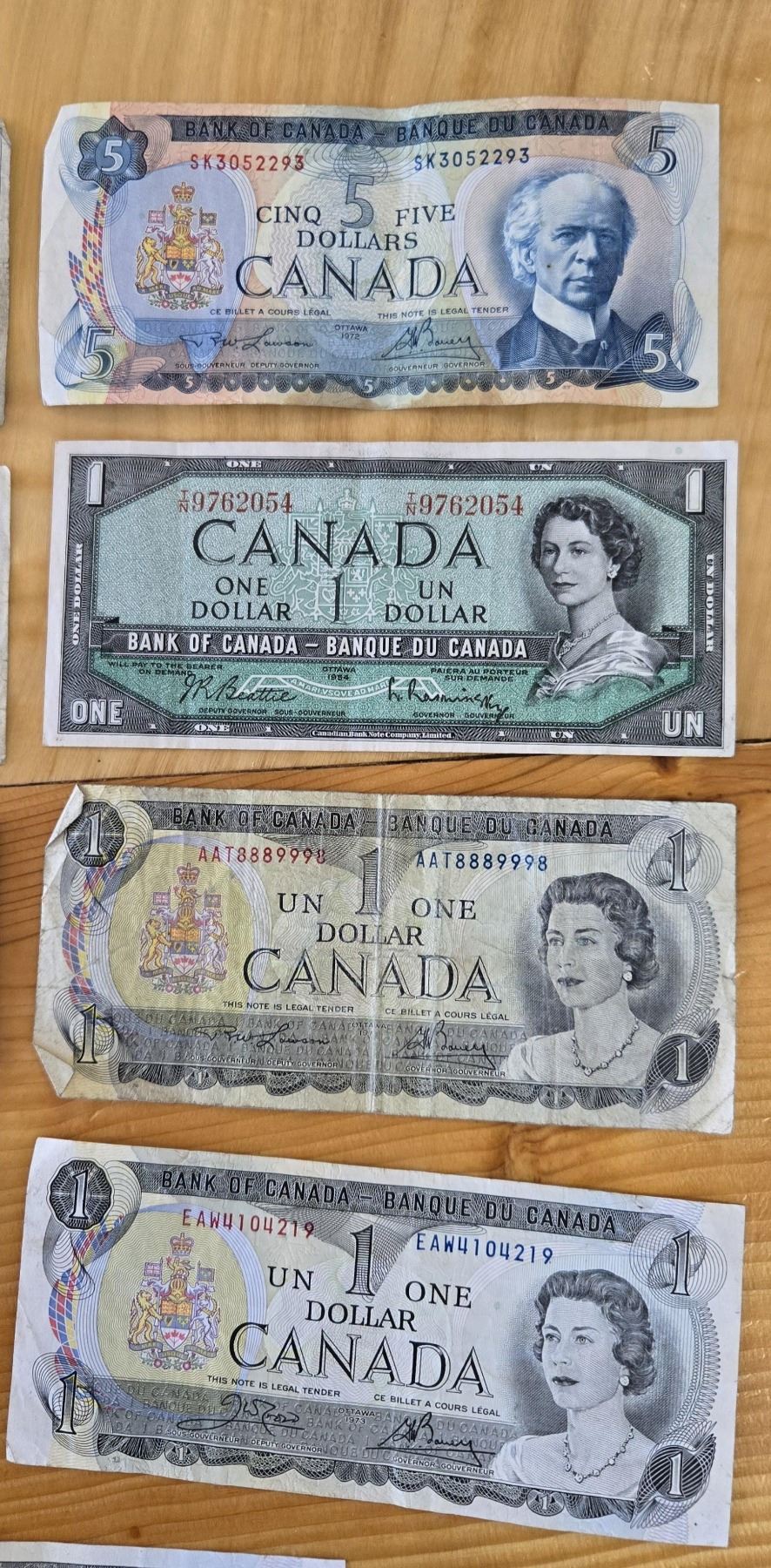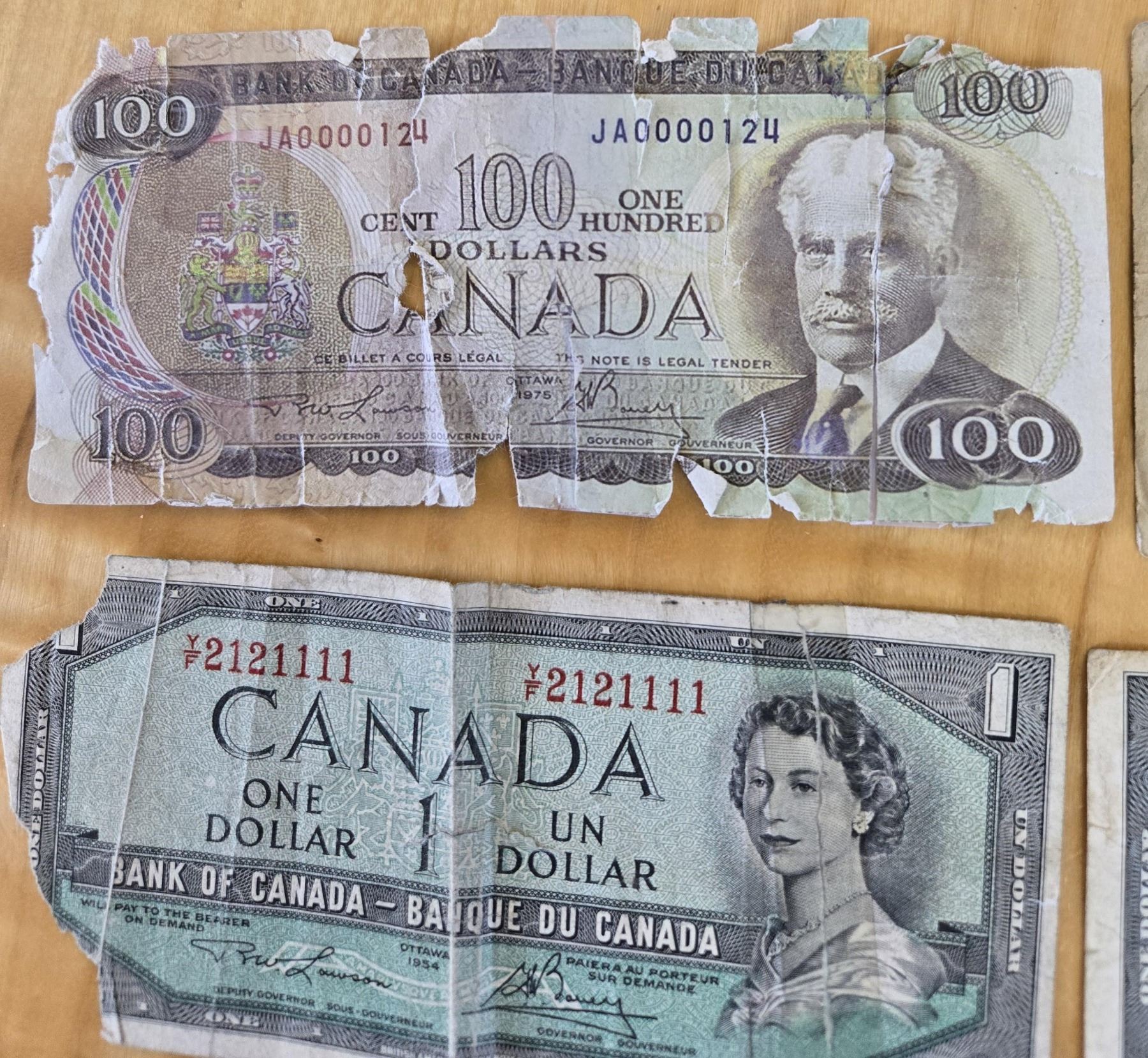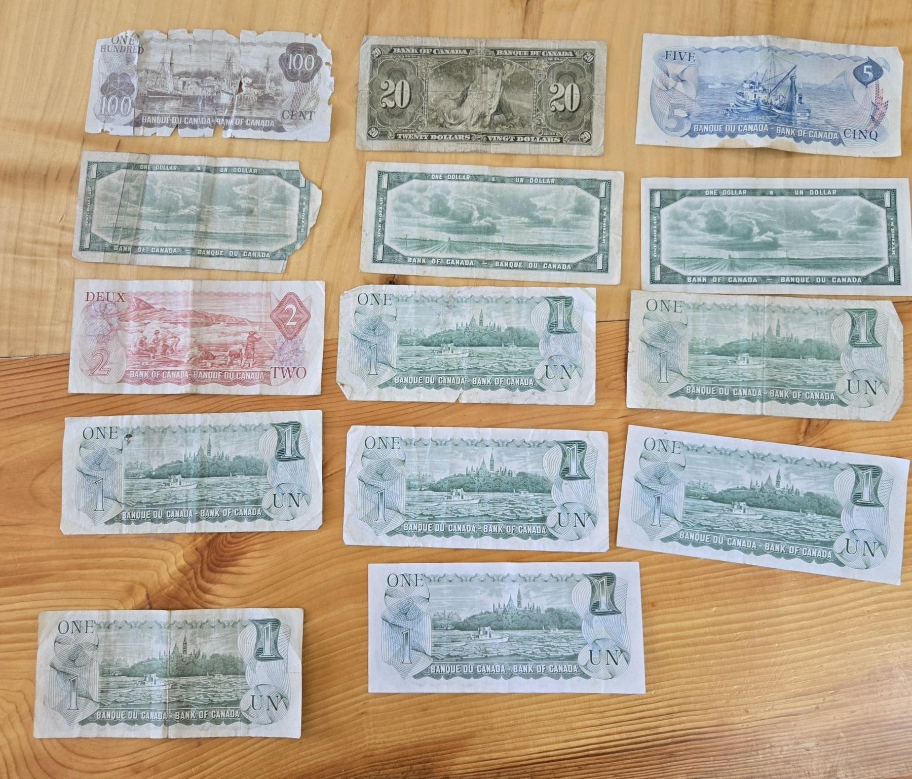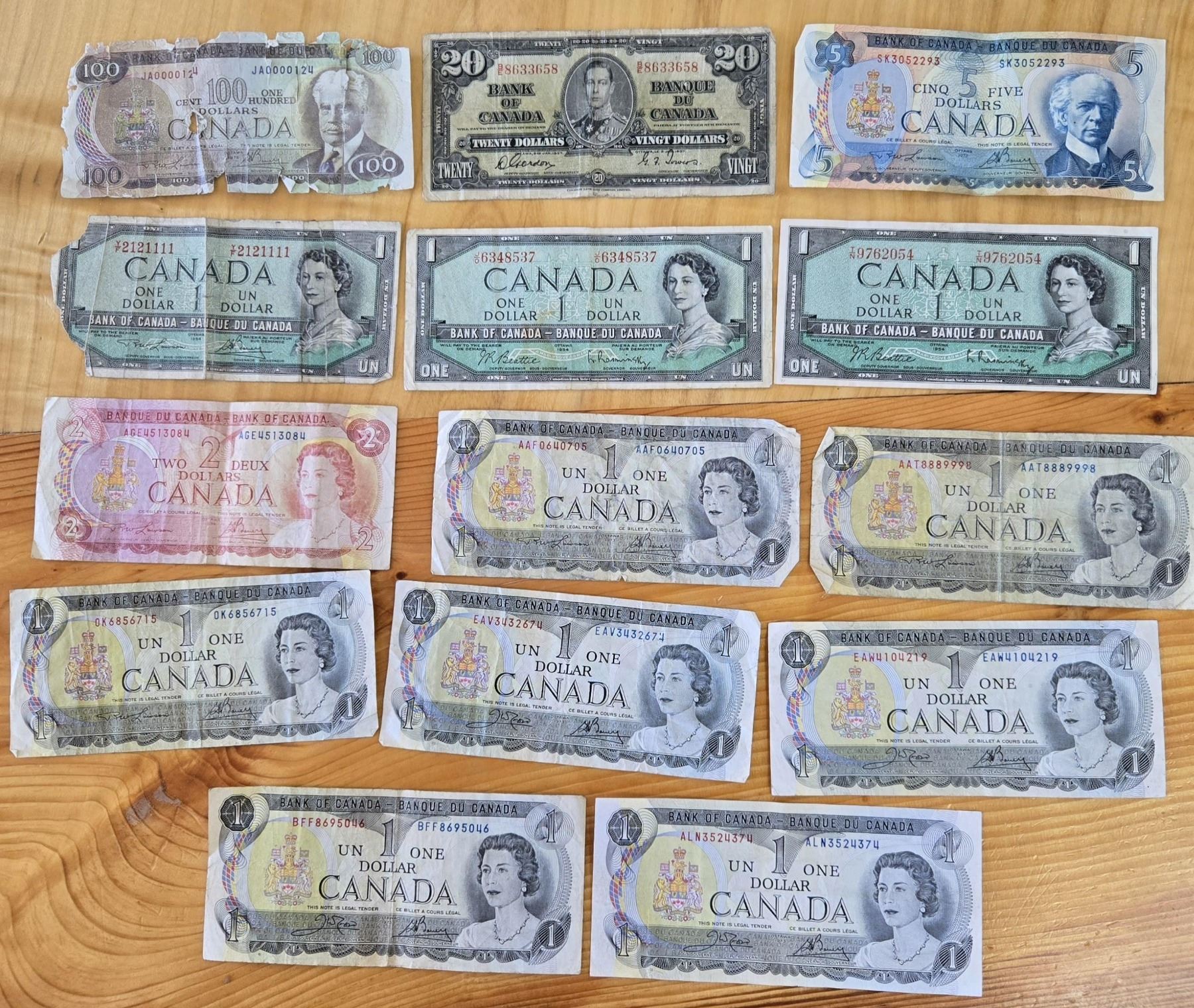 Lot of Fourteen Older Canadian Banknotes including 1975 One Hundred Dollar Banknote with Fancy Serial Number, one 1937 Twenty Dollar Banknote, three 1954 One Dollar Banknotes (one with fancy serial number), one 1972 Five Dollar Banknote, one 1974 Two Dollar Banknote, and seven 1973 One Dollar Banknotes (one with fancy serial number).