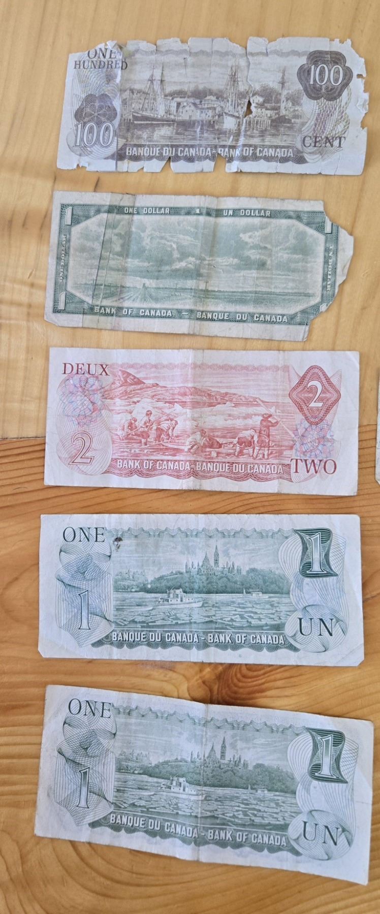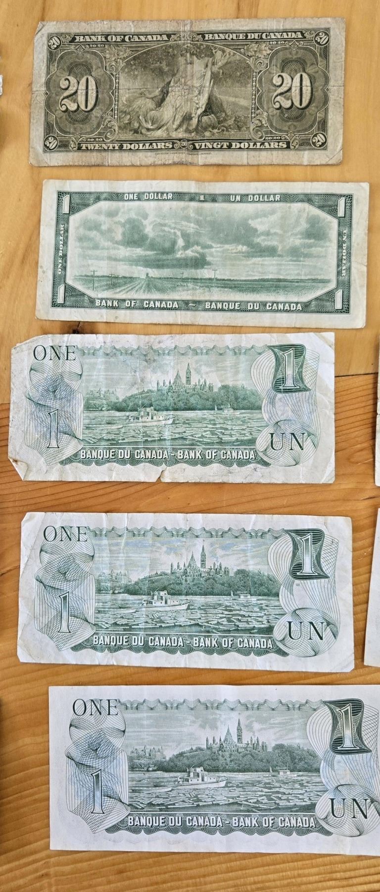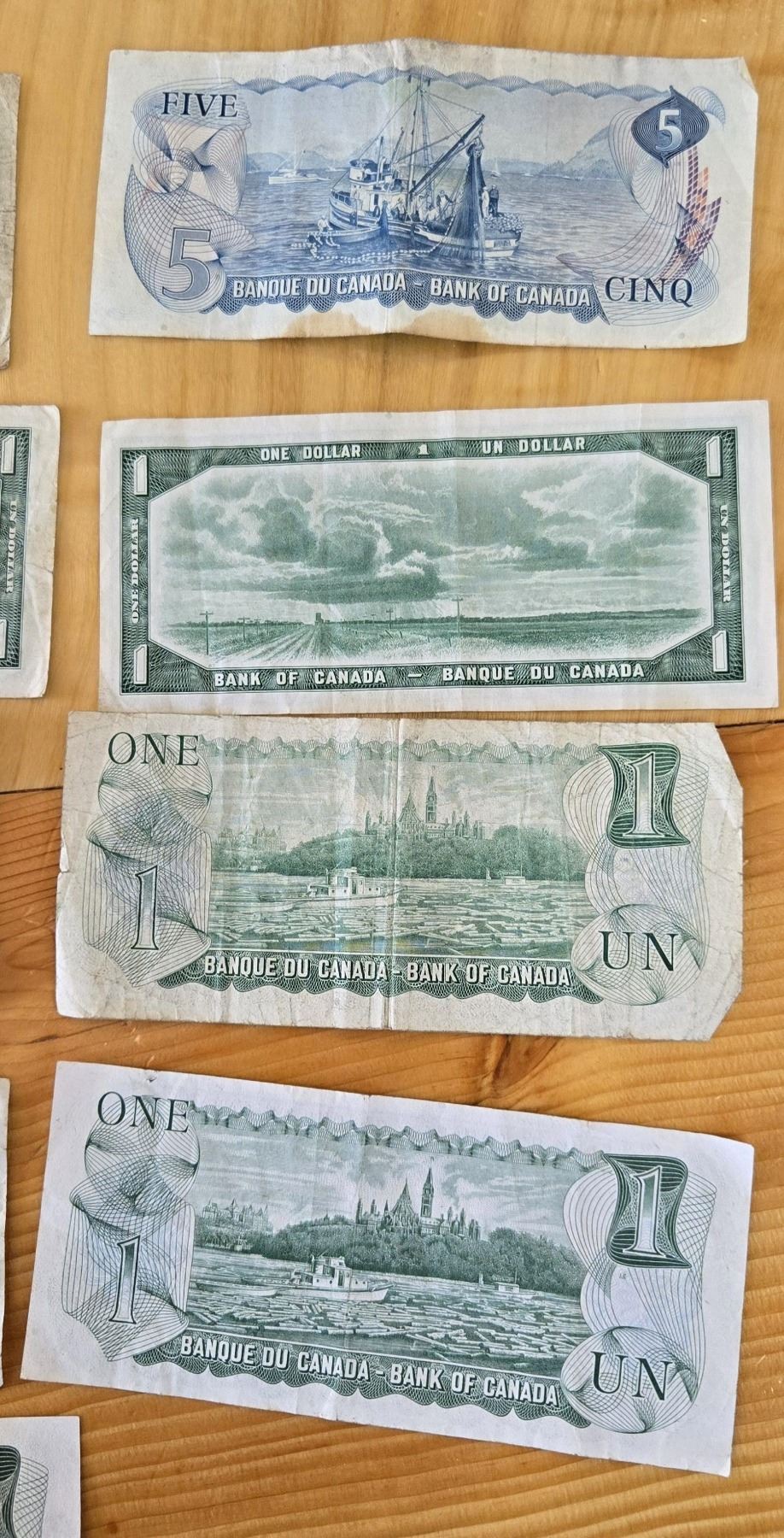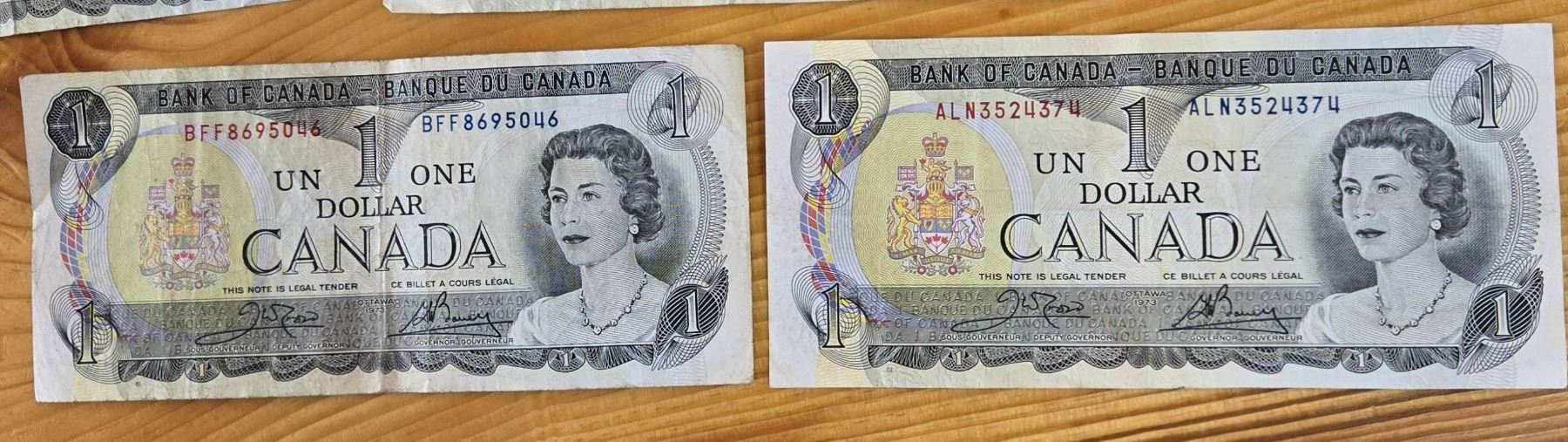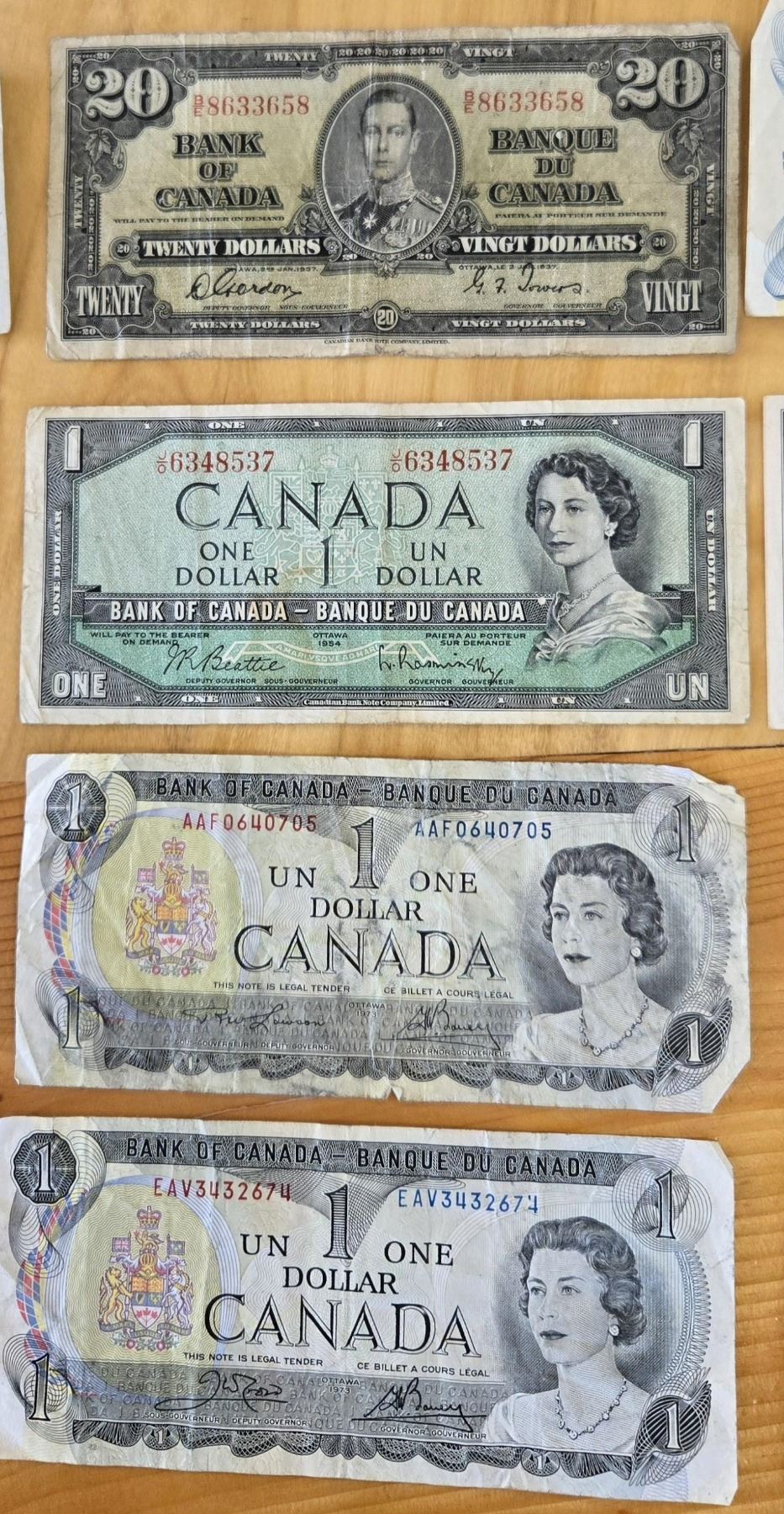 Lot of Fourteen Older Canadian Banknotes including 1975 One Hundred Dollar Banknote with Fancy Serial Number, one 1937 Twenty Dollar Banknote, three 1954 One Dollar Banknotes (one with fancy serial number), one 1972 Five Dollar Banknote, one 1974 Two Dollar Banknote, and seven 1973 One Dollar Banknotes (one with fancy serial number).