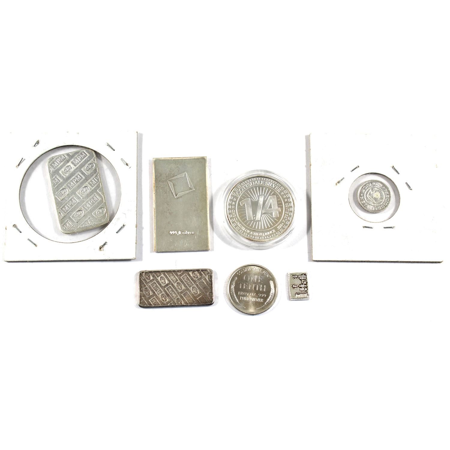 Lot of Fractional .999 Fine Silver of Different Sizes from Various Companies - 2x 1 Gram, 2x 5 Gram, 10 Gram, 1/10oz & 1/4oz (Most pieces toned). 7pcs (TAX Exempt)