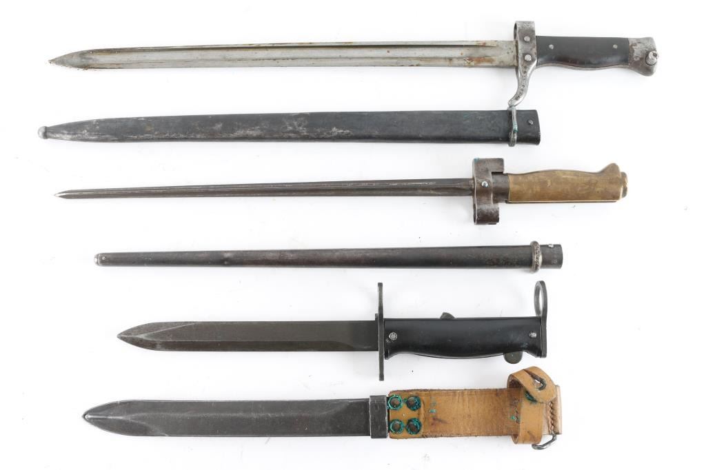 Three total. 1) French MAS 49/56 bayonet, 8" blade. Scabbard & crossguard is marked MAT-F. ( Manufacture d'Armes Tulle) Very good condition. 2) WW1 French Lebel M1886/15 Cruciform Bayonet with Scabbard, 13 1/4" blade, brass hilt, round steel scabbard, very good condition, nice patina. 3) Mle 1892 Berthier bayonet, WW1 era with the shortened quillon. 15 3/4" blade. Blade has dried cosoline, and a patch of surface rust on the ricasso, should clean up. Steel scabbard.