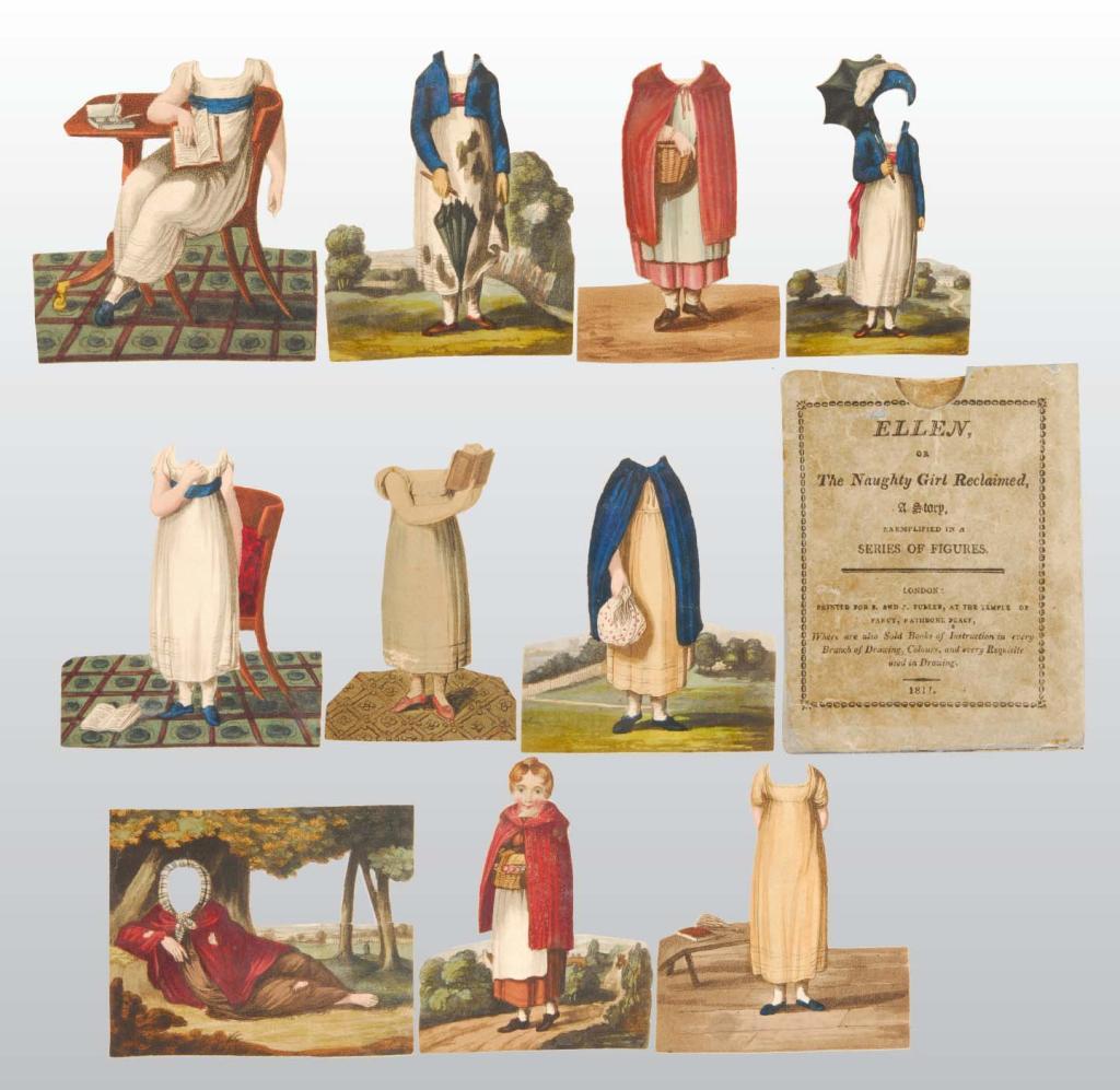 Description Dated 1811. "Ellen or the Naughty Girl Reclaimed". Published by the Fuller Company, London, the book includes ten costumes. For a naughty girl, Ellen acquires some lovely outfits and learns to read and write, too. Ellen's headpiece has a neck bend; the clothing is in excellent condition. The case and the book are in poor condition with soil, splits, and wear.