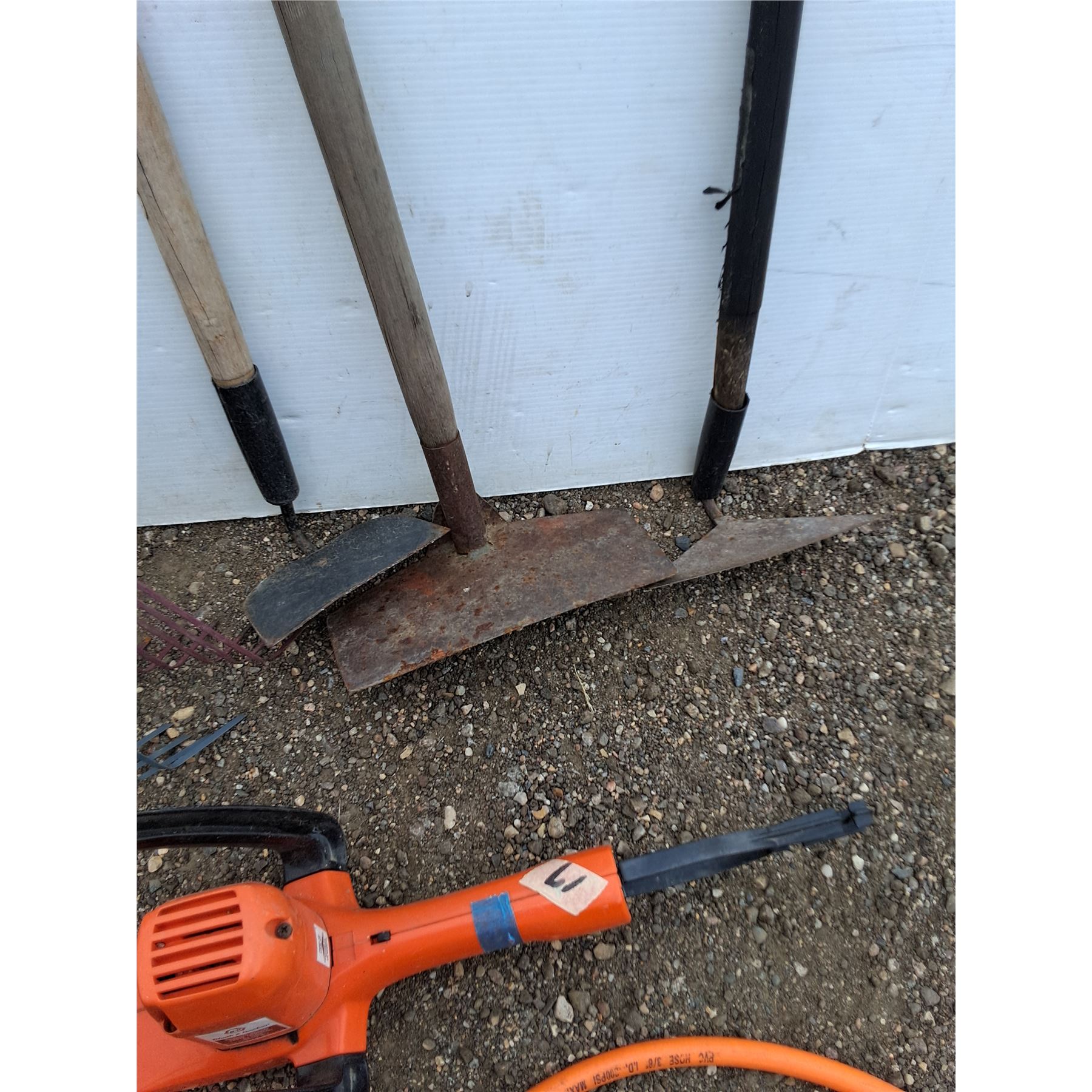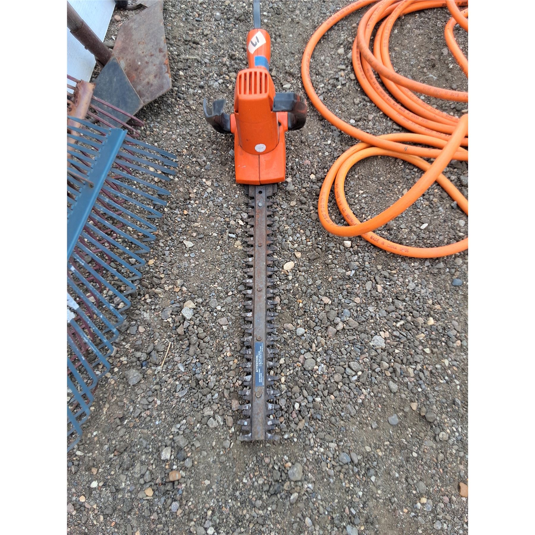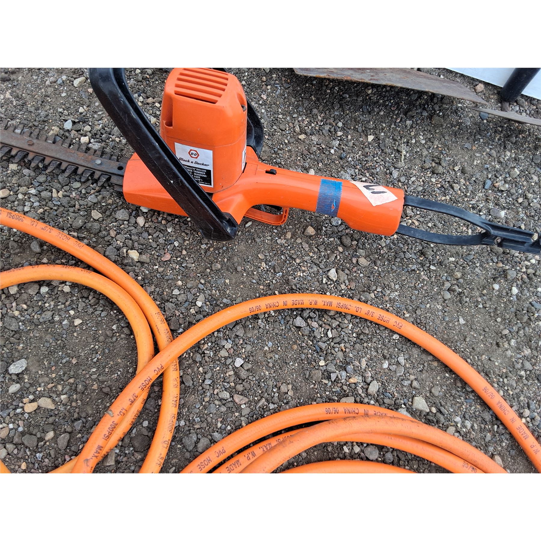 CANNOT SHIP Lot of Garden Tools, (2)Leaf Rakes, (3)Hoes, Electric Black and Decker Hedge Trimmer, Pvc 3/8 Hose Approx. 10 Feet