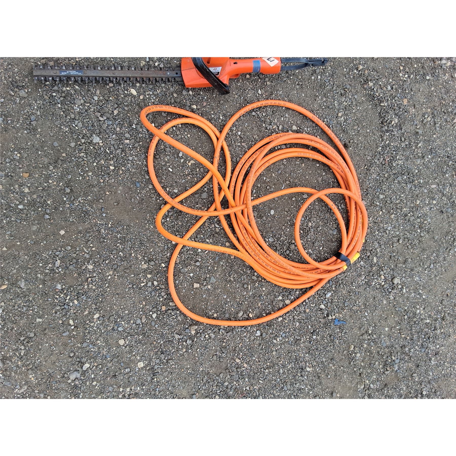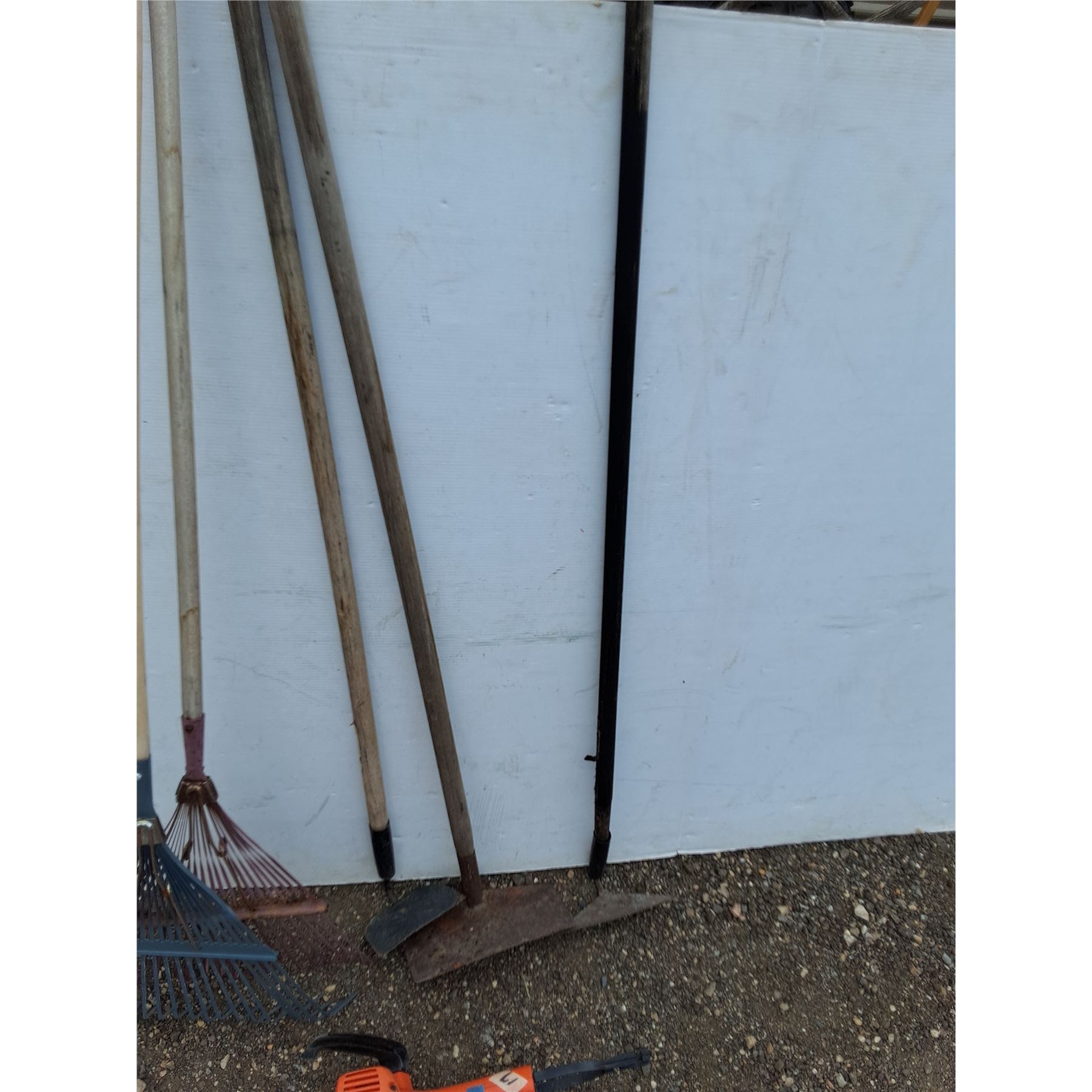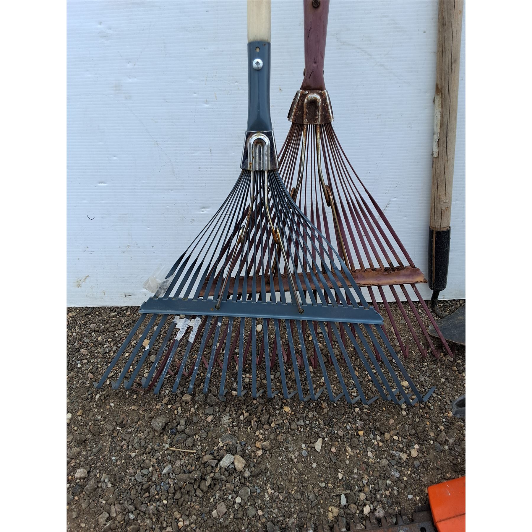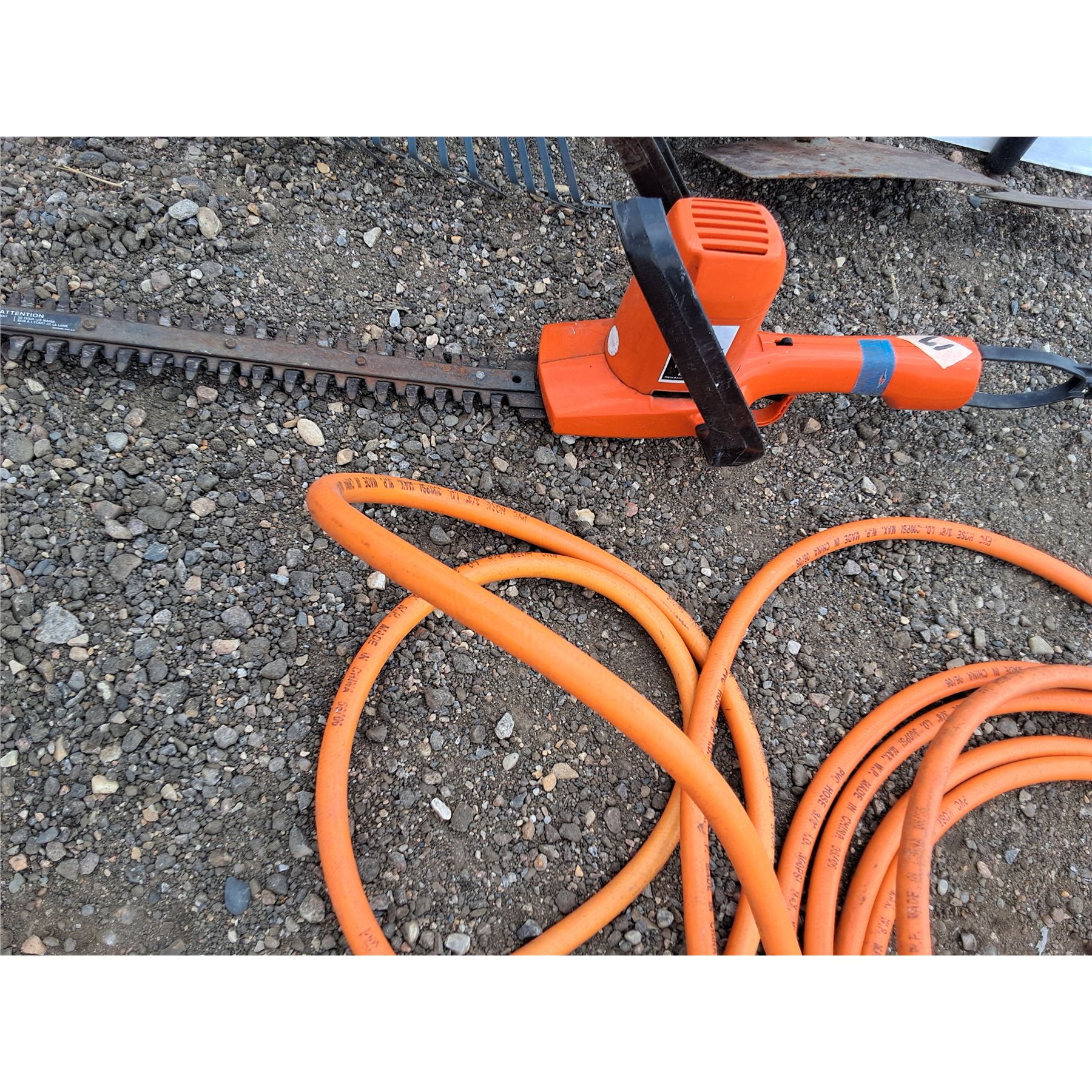 CANNOT SHIP Lot of Garden Tools, (2)Leaf Rakes, (3)Hoes, Electric Black and Decker Hedge Trimmer, Pvc 3/8 Hose Approx. 10 Feet