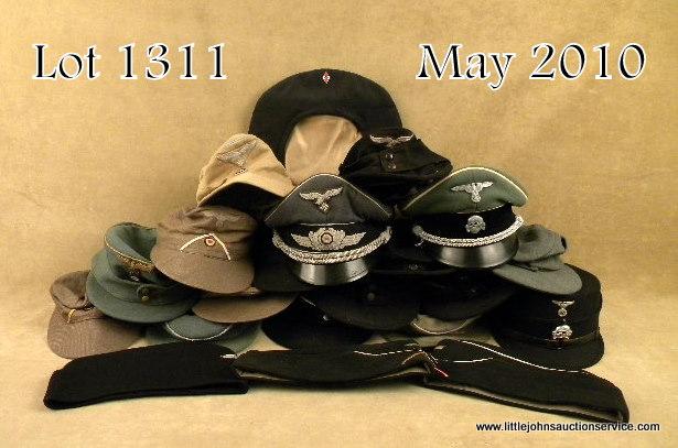 Lot of German M43 and overseas caps from the various branches of German service; tropical, Panzer, army, and others. All reproduction sold for costume or display. Approx. 20 pieces. Some elements are original but none completelyauthentic. A good display lot. Est: $500 - $1,000