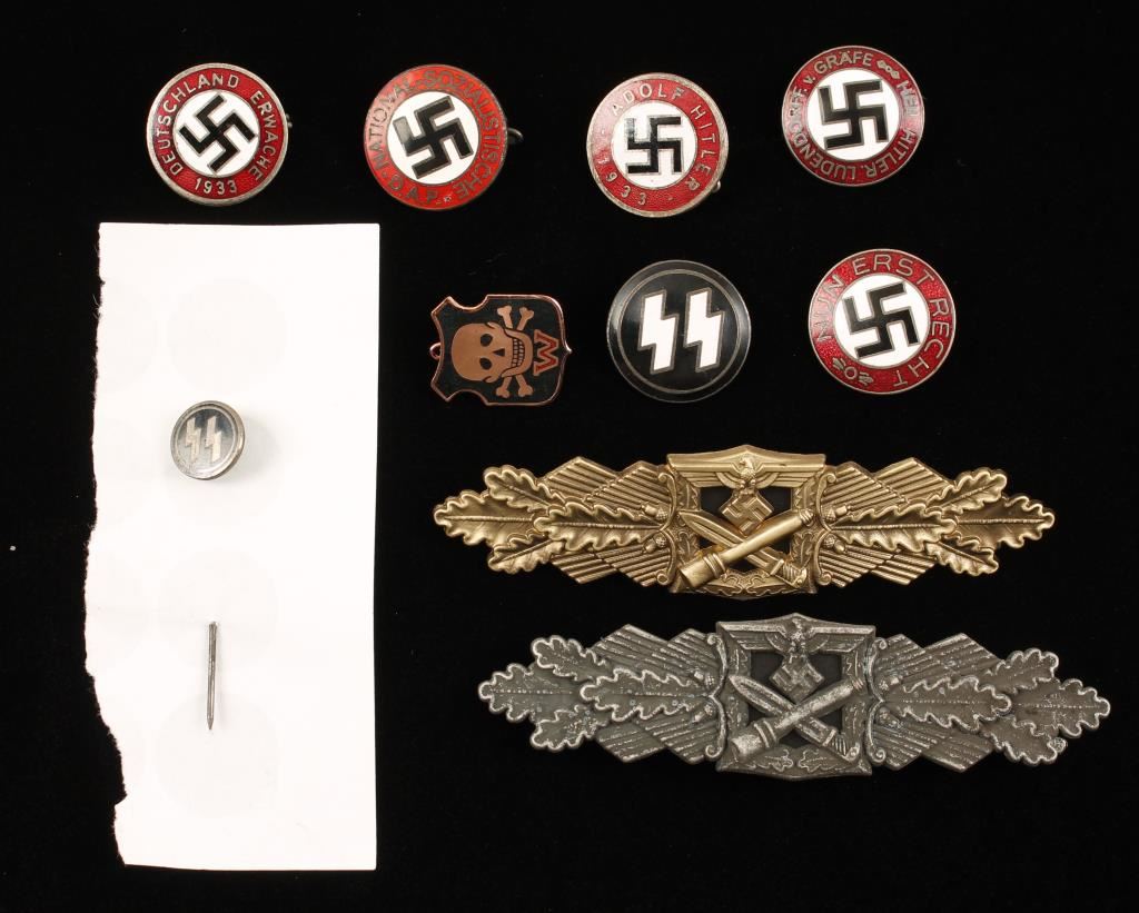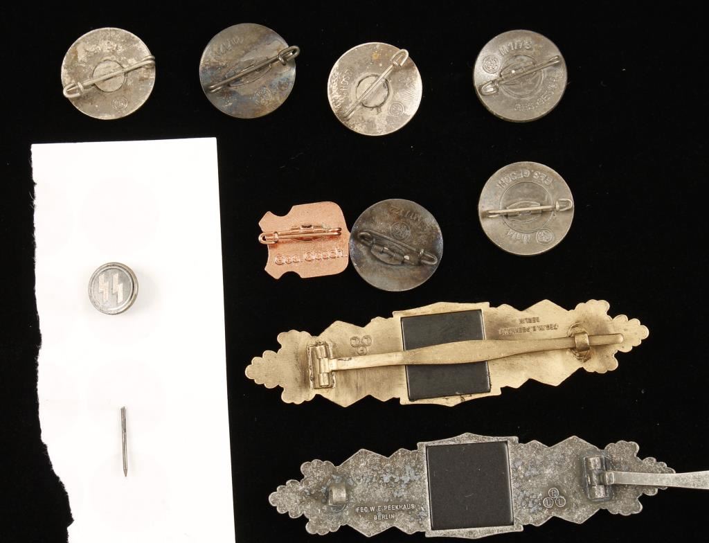 Including; Army Silver Close Combat Clasp-maker marked 'Fee W.E. Peekhaus Berlin FFL', has a wide horizontal pin back, Army Gold Close Combat Clasp-maker marked 'Fee W.E. Peekhaus Berlin FFL', has a wide vertical pin back, Political Enameled Party Badges- measures 1 15/16" in diameter, all are maker marked 'RZM' and have a thin horizontal pin back with nickel and enamel construction. Offered "as is", we don't guarantee the authenticity of this item, please do your research. All sales are final.