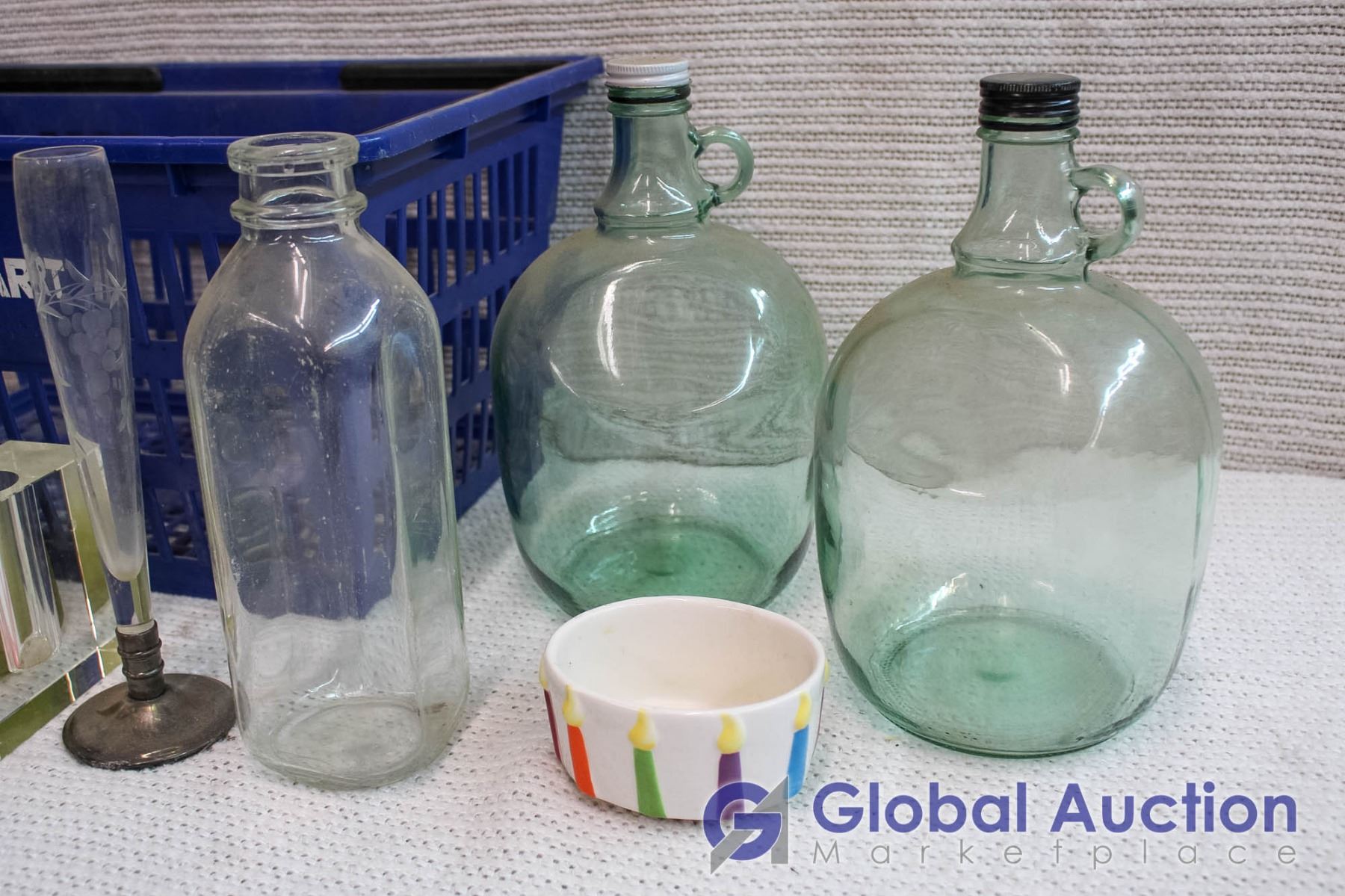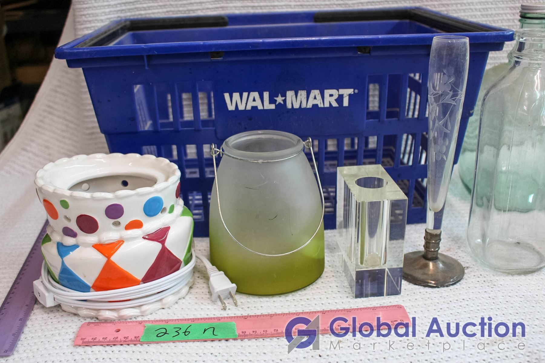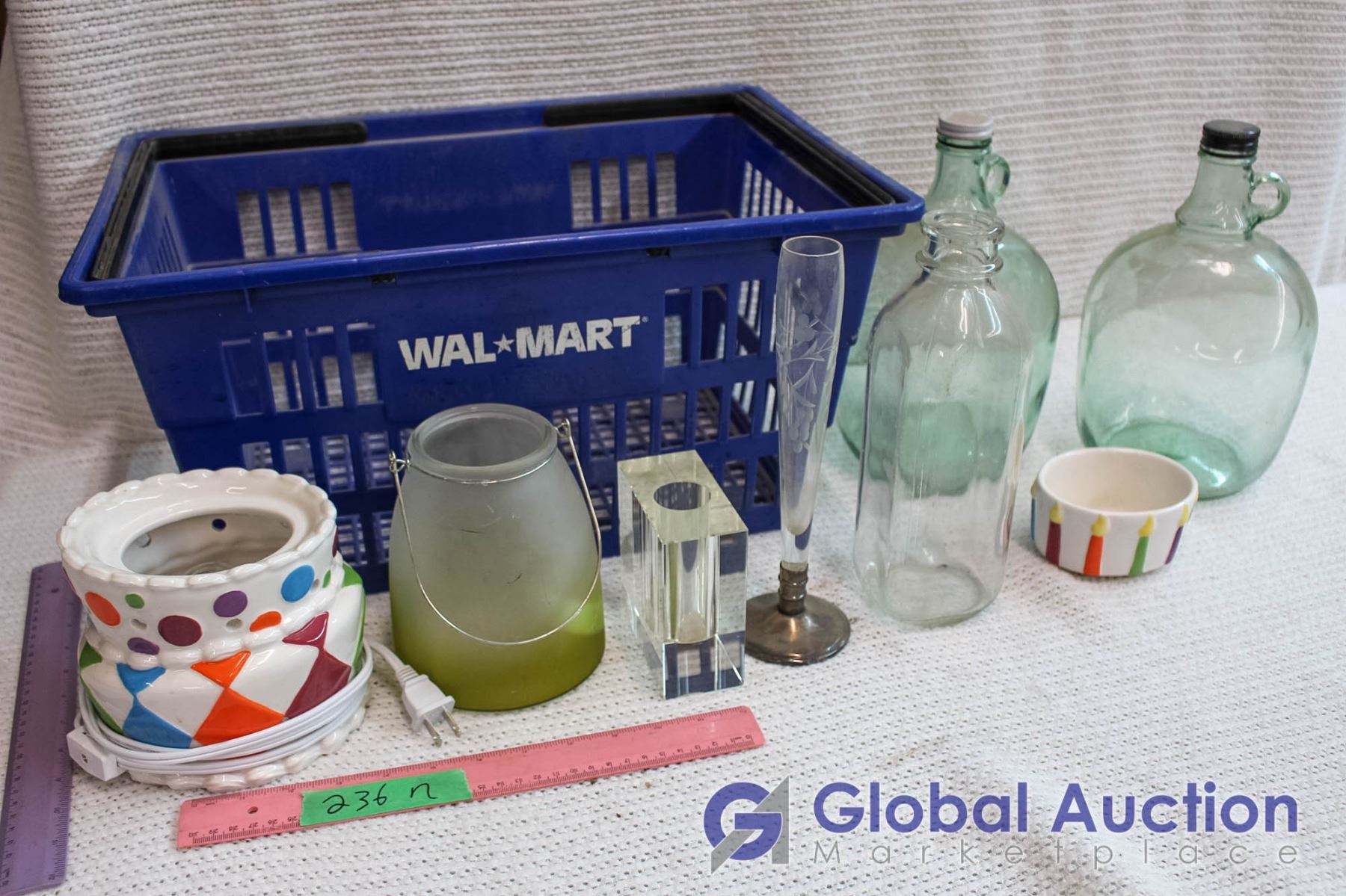 Lot of Glass Bottles, Decor and Wax Melter W/ Walmart Crate