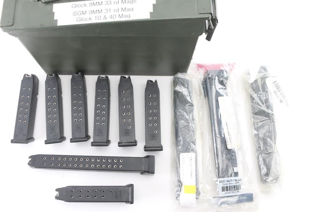 Four aftermarket 33 rd 9mm, three Glock OEM 13 rd 45 ACP, four Glock OEM 15 rd 40 S&W mags.