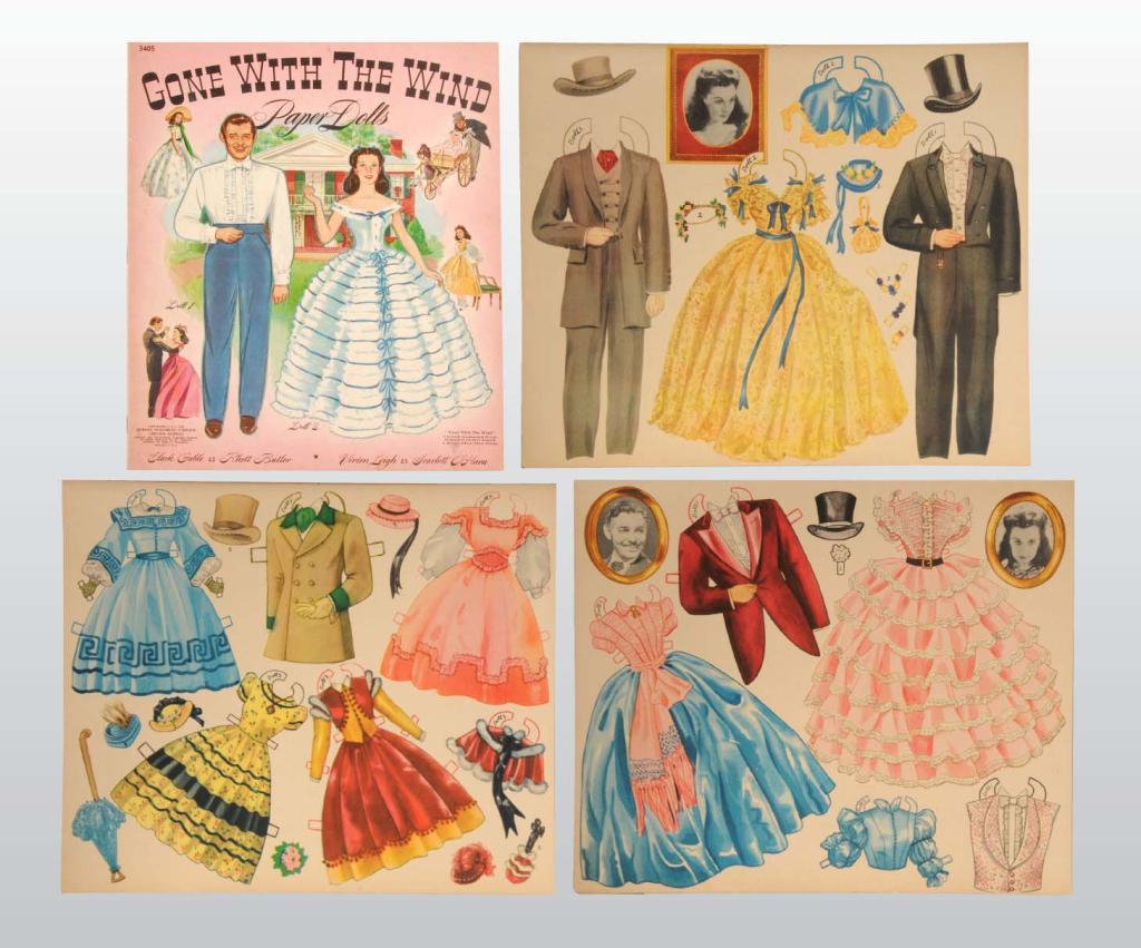 Description Dated 1940. This uncut 11" x 14" GWTW was published by the Merrill Company and has five dolls and eight clothing pages with small cameo pictures from the film. Outfits included the Barbecue Dress, the Drapery Dress, the Kissing Ashley Dress-- enough wonderful costumes to keep Scarlett, Rhett and Careen magnificently garbed. Light cover dings and soil. A wonderful book with clothing and characters from a classic film.