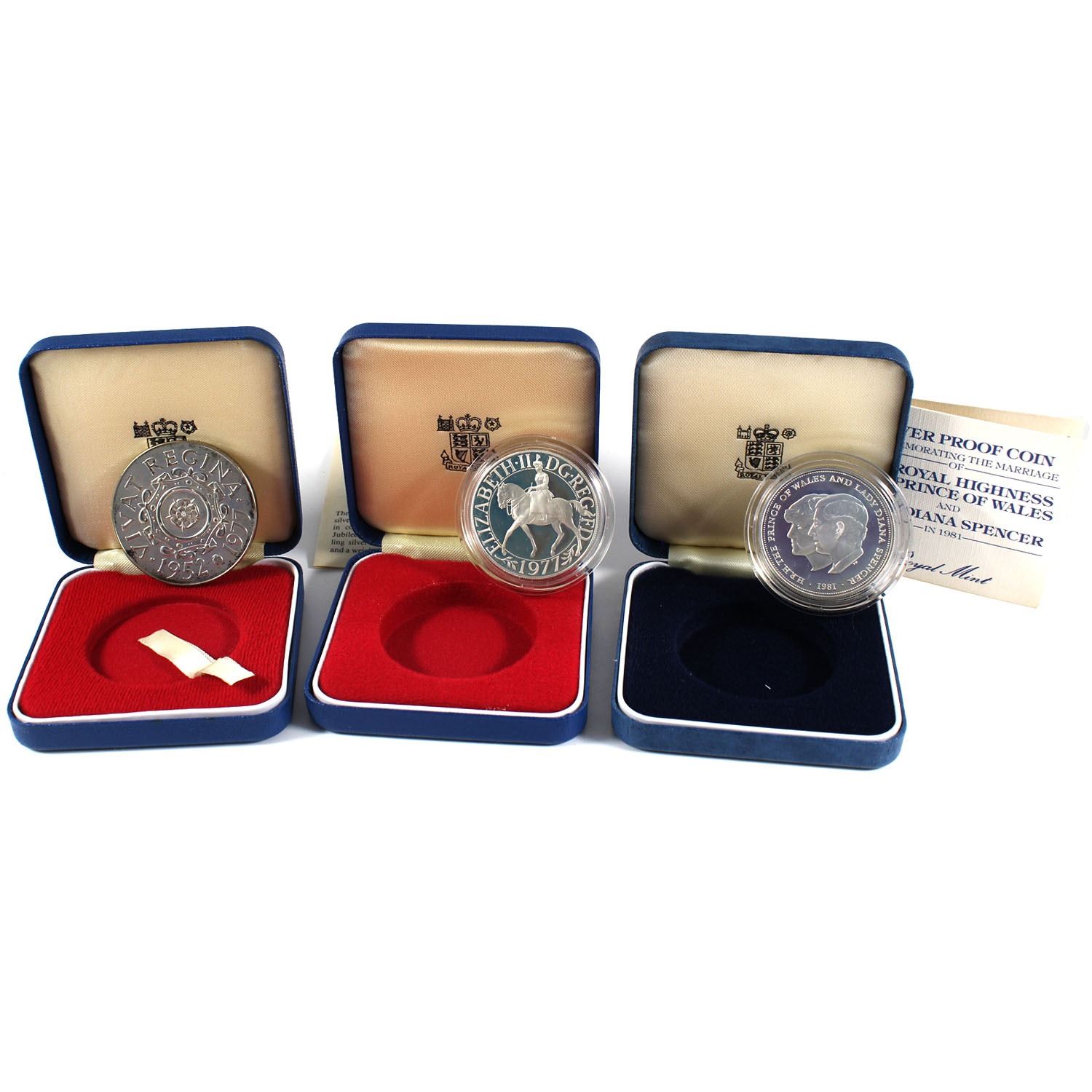 Lot of Great Britain Commemorative Sterling Silver Coins in Original Blue Display Boxes. You will receive 2x 1952-1977 Silver Jubilee of Elizabeth II both different design & 1981 commemorating the marriage of Price of Wales and Lady Diana (coins are toned). 3 coins containing 3.23oz Fine Silver total.