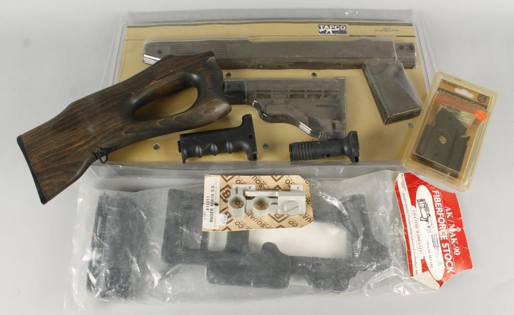 Including: Ruger Mini 14 S.S. scope rings. Handgun grips by Pachmayr "signatr B92SB/F", woodhandle buttstock, and AK/Mak 90 Fiberforce stock. And Tapco collapsible stock 10/22 T6.