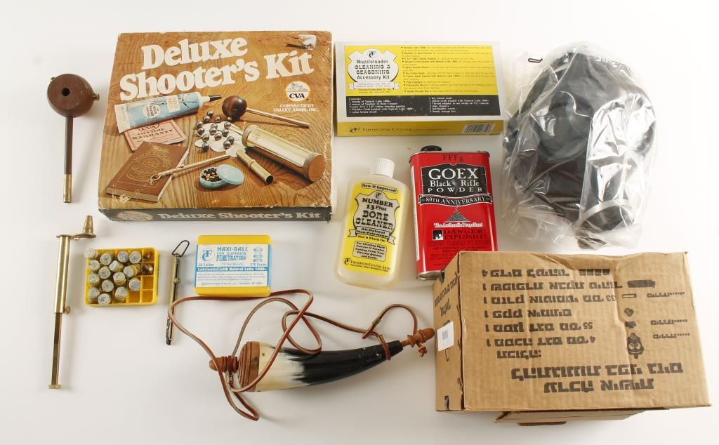 Includes: (1) partial Thompson/Center Muzzleloader Cleaning & Seasoning Accessory Kit, used. (1) CVA Deluxe Shooters Kit, .50 Cal percussion, AC144. (1) Powder horn. (1) Gas mask with original box and manual. And more