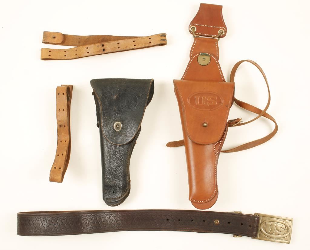 US marked belt holster, dark brown basketweave leather belt with US brass buckle, leather sling, and black leather Bucheimer holster.