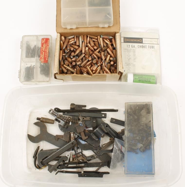 Miscellaneous small gun parts. Swivel bases, box of bullets of various weights and calibers, choke tube, sights and screws, flat springs, etc.