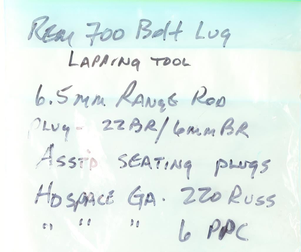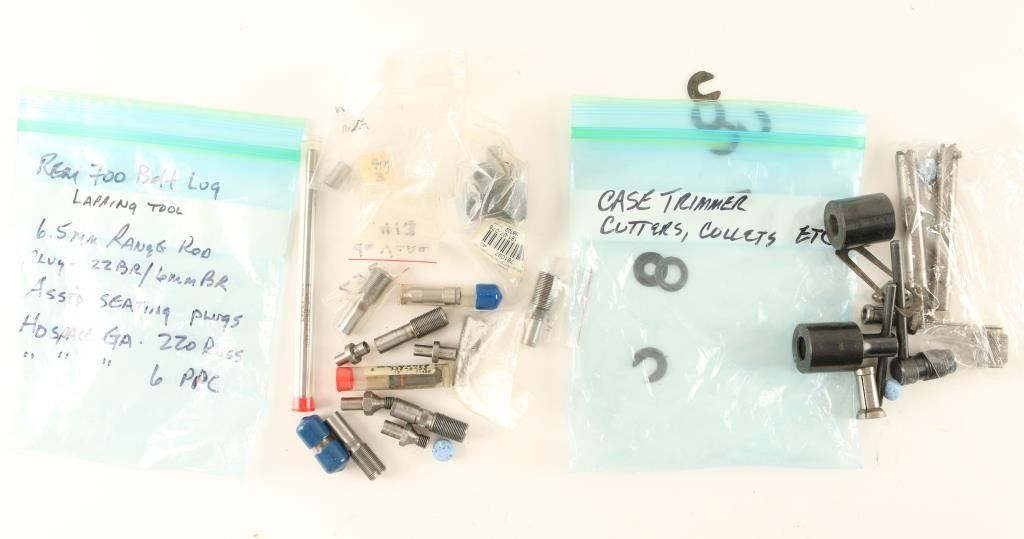 Including case trimmer, cutters, lapping tool, Rem. 700 bolt lug, 6.5 mm range rod, Plug for 22BR/6mm BR, assorted seating plugs & more