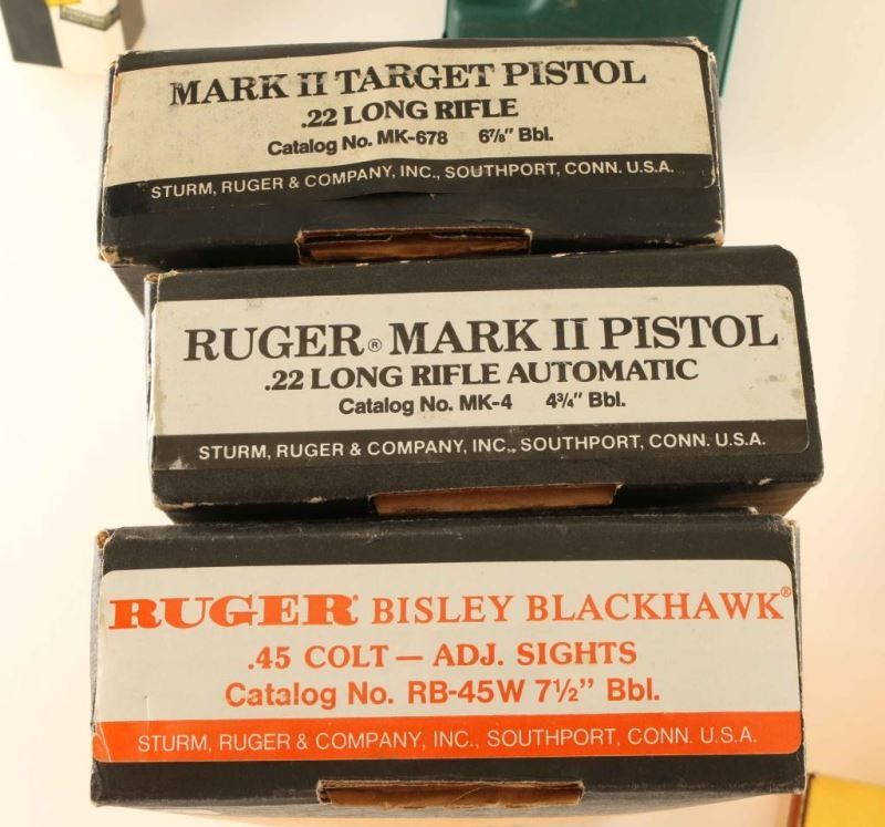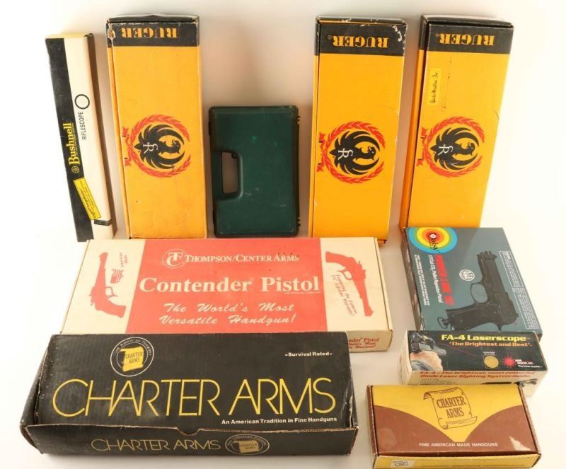 Including; Ruger Bisley Blackhawk 45 Colt, 2 boxes for Ruger Mark II Pistol 22LR (MK-4 and MK-678), Charter Arms Bulldog, Bushnell ScopeChief VI, FA-4 Laserscope, plastic case for Kimar 911, Daisy Power Line 92 air pistol, Charter Arms Explorer II 22LR SA pistol, and a box for a Thompson Center Arms Contender Frame. Some include papers.