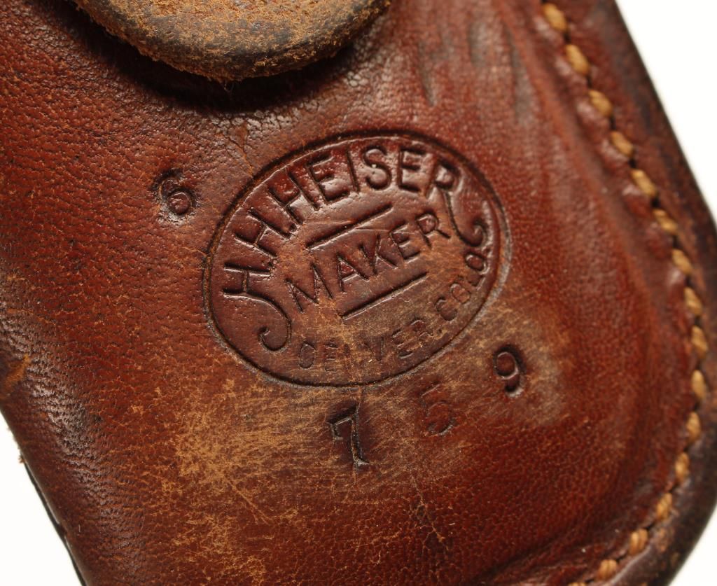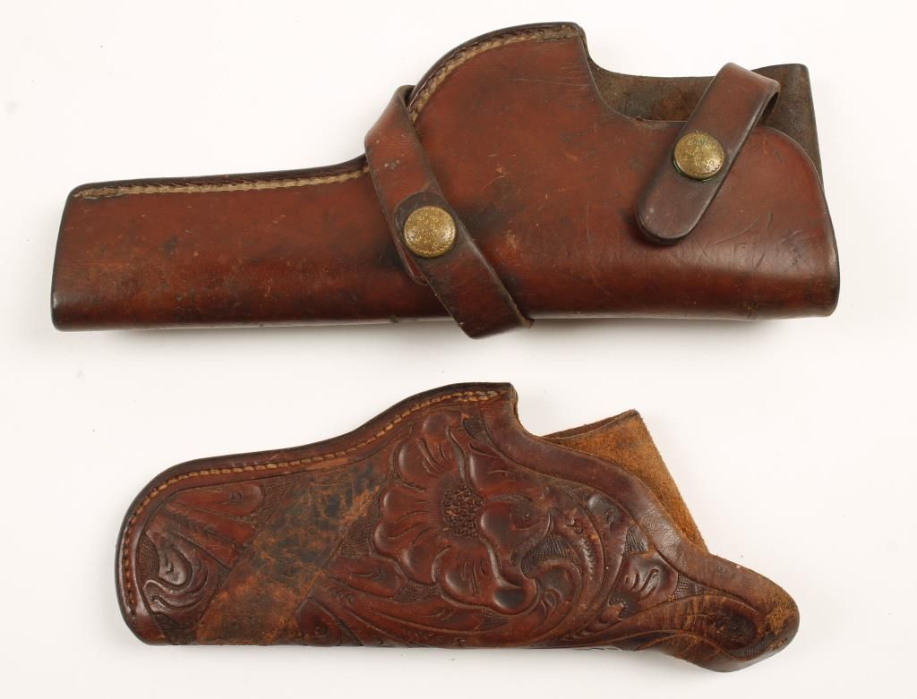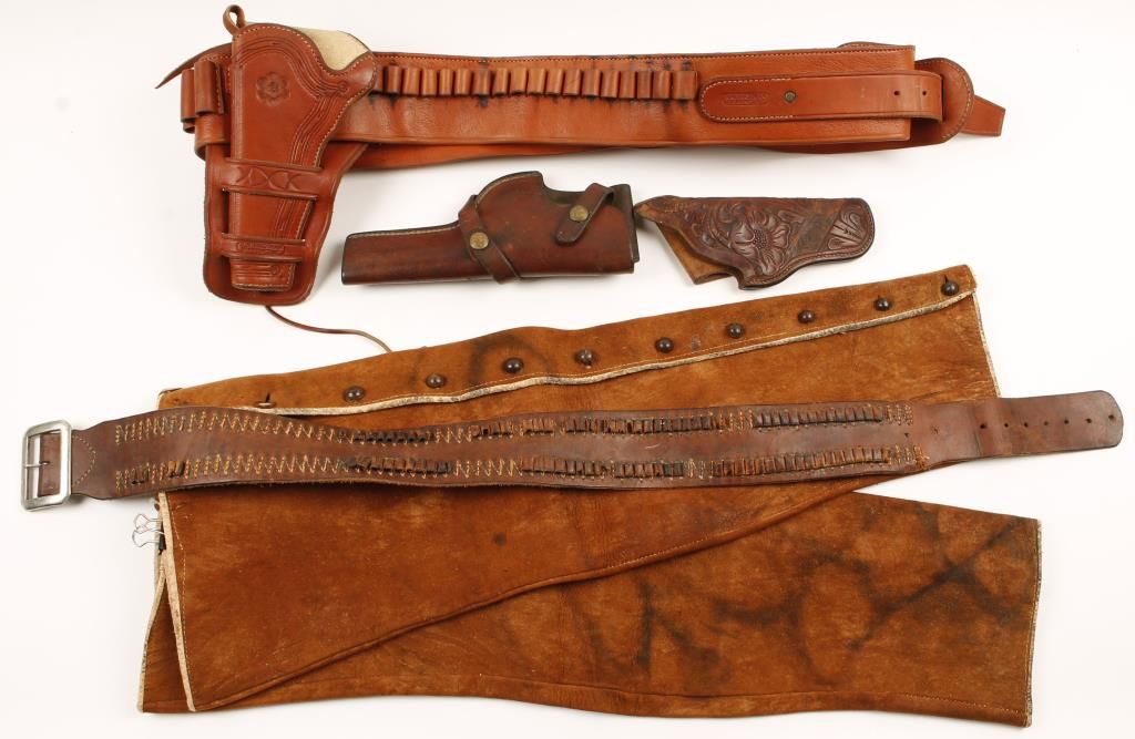 Includes 1 set of chaps made from suede with Mexican styling, modern reproduction. 1 Brauer Bros. holster, 1 Heiser leather holster with stitching on belt loop missing, 1 single holster rig form R.M. Bachman and 1 Colorado Saddlery ammo belt for .22 with about half of the loops missing.
