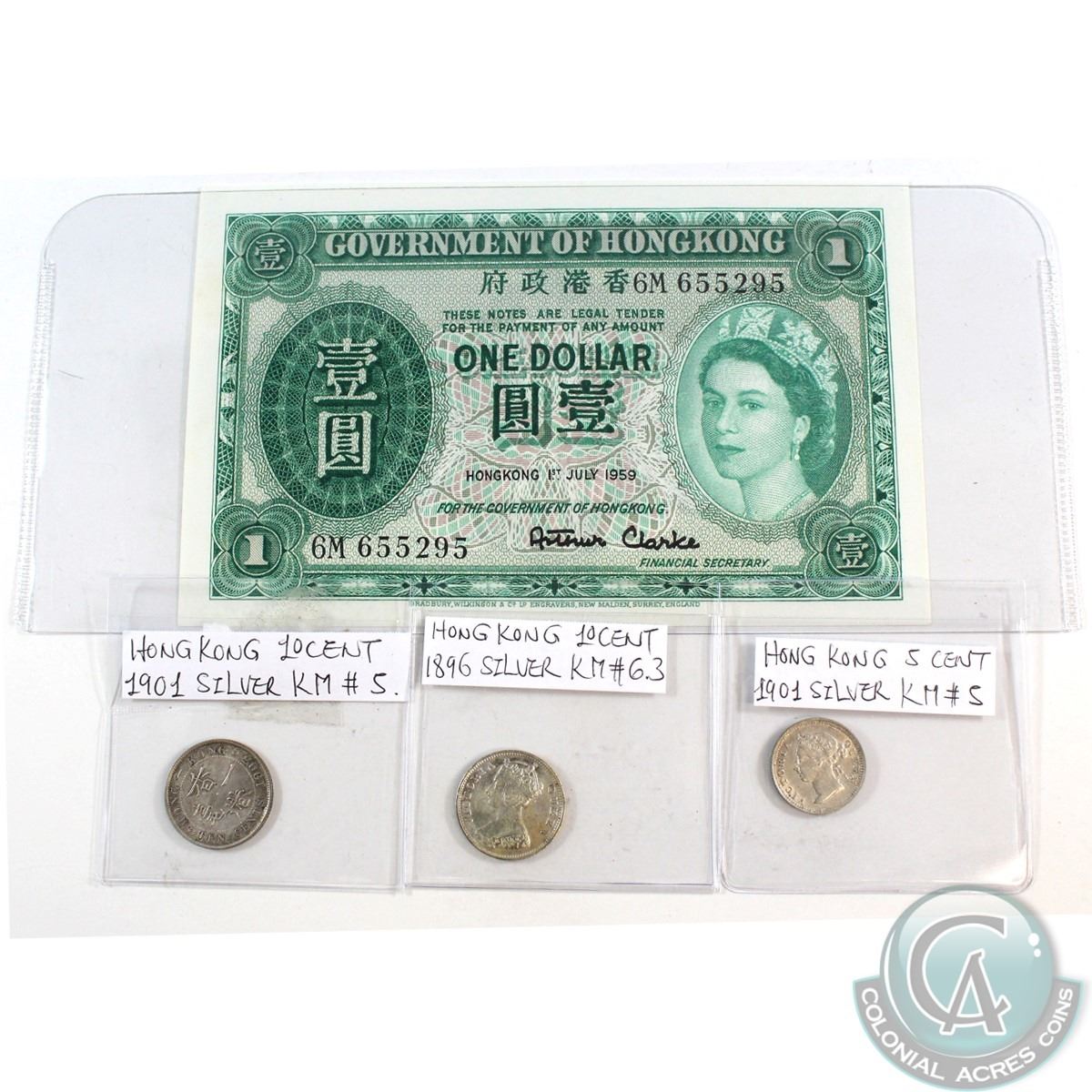 Lot of Hong Kong Silver Coins and Paper Money. You will receive a 1896 10-cent, 1901 10-cent, 1901 5-cent & 1959 Government of Hong Kong One Dollar Bill. 4pcs