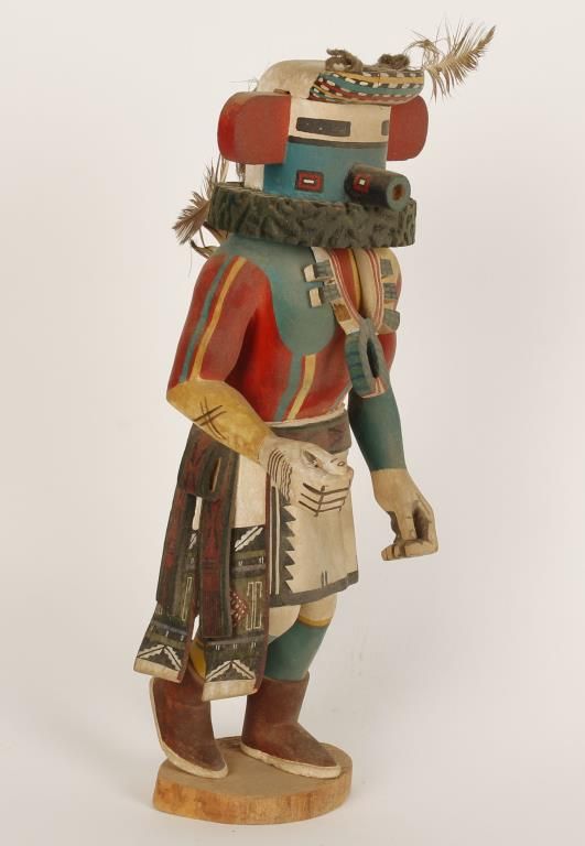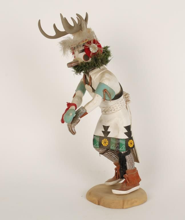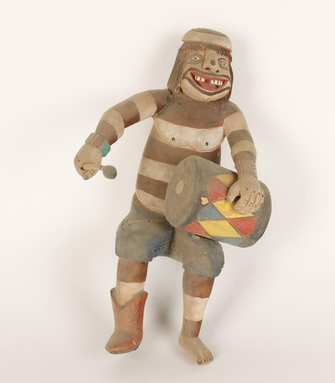 (1) Tewa Clown by Fred Chapella. Carved of all wood, then hand painted. Kachina has one cowboy boot on and is playing a drum. (1) Deer hand made all wood by Eli Taylor. (1) All wood with painted clothing. Signed on foot.