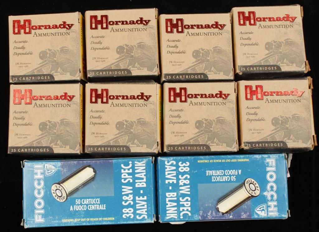 Eight boxes (200 rounds) of live ammo. Also includes two boxes of Fiocchi .38 S&W Blank ammo.