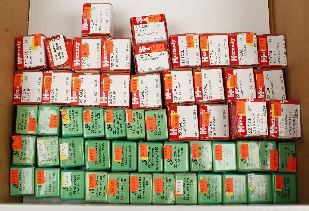 7 boxes Hornady 17 Cal., 14 boxes Hornady 22 Cal., and 31 boxes Sierra 22 Cal. bullets.